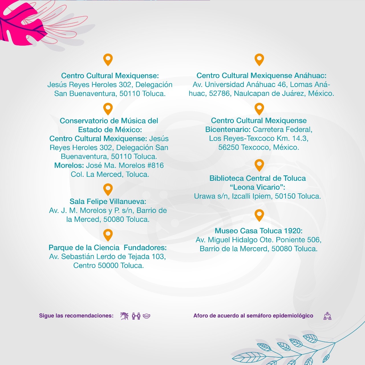 Inicio ACTIVIDADES CULTURALES EN EL MARCO DEL DÍA INTERNACIONAL DE LA MUJER Ubicación de las Sedes de Mujerees por la Cultura, de la Secretaría de Cultura, Turismo y Deporte, del GEM.