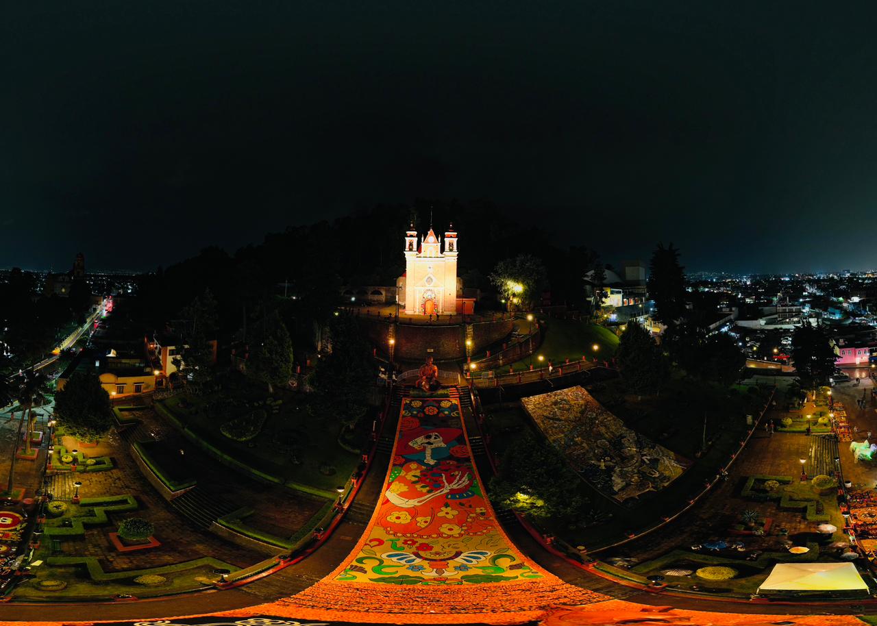 Vista aéres nocturna de la iglesia derl Calvario de Metepec, con su escalinata con motivos de Fiestas de Muertos 2025
