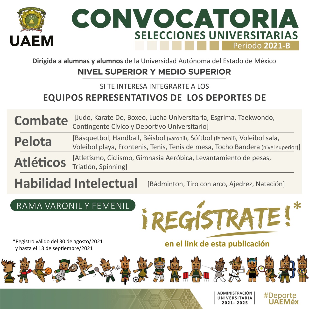Para integrar los equipos deportivos de la Autónoma mexiquense, las y los universitarios interesados de los niveles medio superior y superior podrán registrarse antes del […]