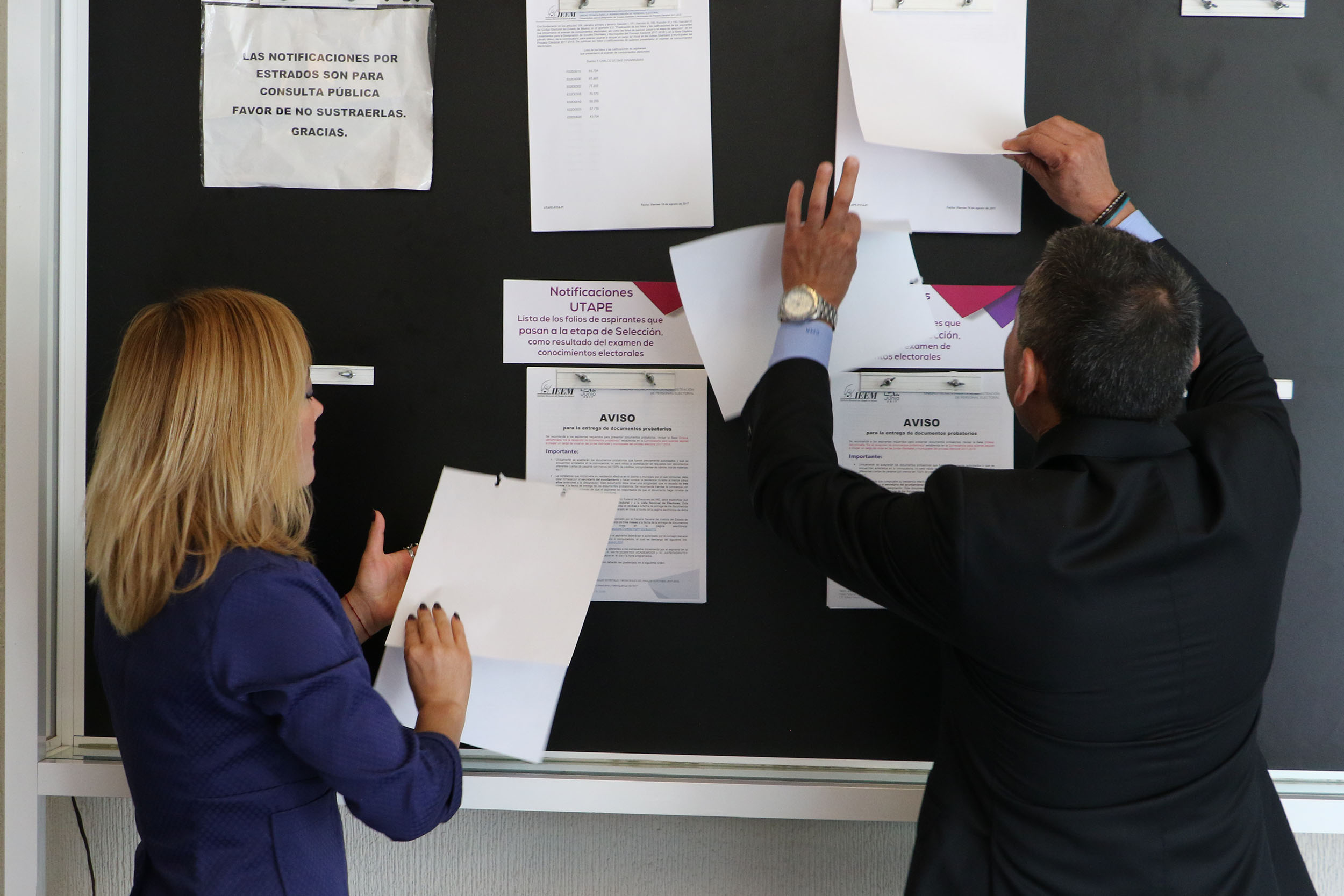 En un ejercicio de máxima publicidad y de acuerdo con los plazos que establece la convocatoria, el Instituto Electoral del Estado de México (IEEM) publicó en estrados y en la página electrónica (www.ieem.org.mx), las listas con los folios y calificaciones de los aspirantes a Vocales Distritales y Municipales que presentaron el examen de conocimientos electorales, así como las listas de quienes pasan a la etapa de selección, las cuales se encuentran organizadas por distrito, municipio y género.
