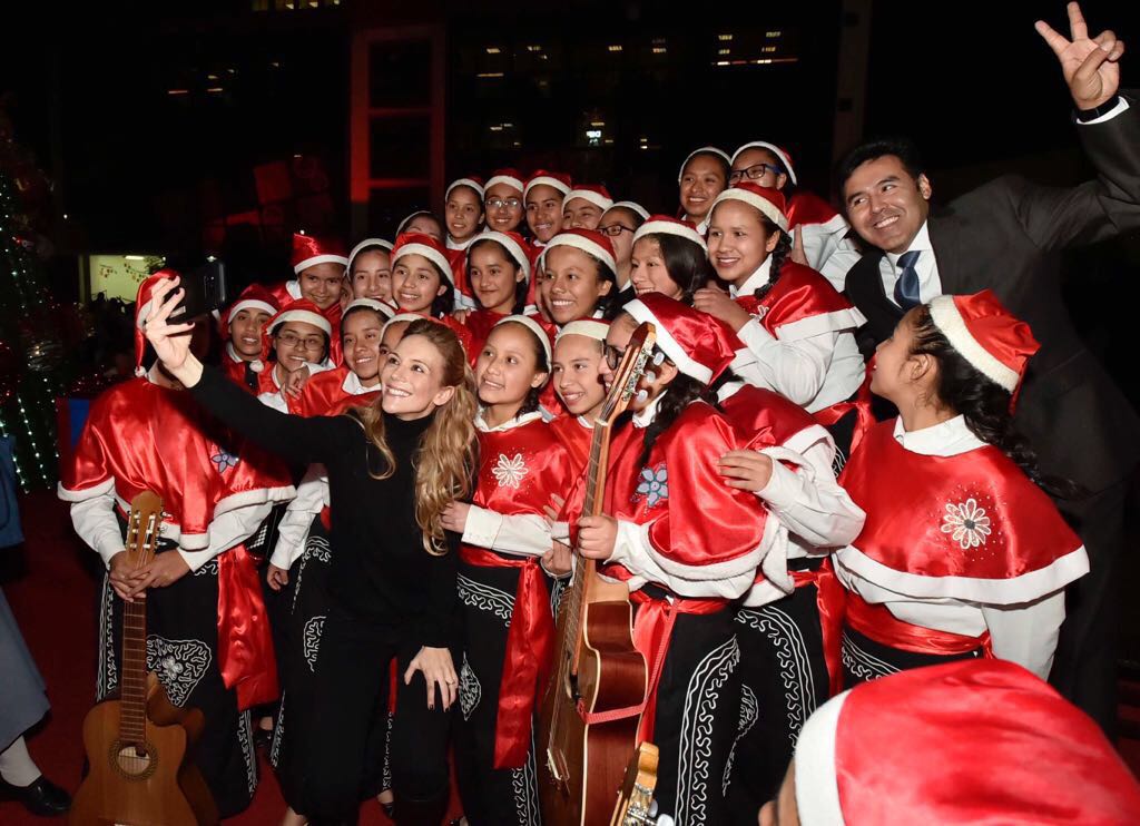 Toluca, México, 5 de diciembre de 2017.- En una velada mágica, enmarcada por las melodías de villancicos navideños, sonrisas y aplausos, pero sobre todo, por la unión a favor de la asistencia social e integración familiar, Fernanda Castillo de Del Mazo, Presidenta honoraria del DIF mexiquense, encendió el árbol de Navidad del DIFEM, decorado con 150 esferas elaboradas artesanalmente con materiales reciclados u originarios de la entidad mexiquense.