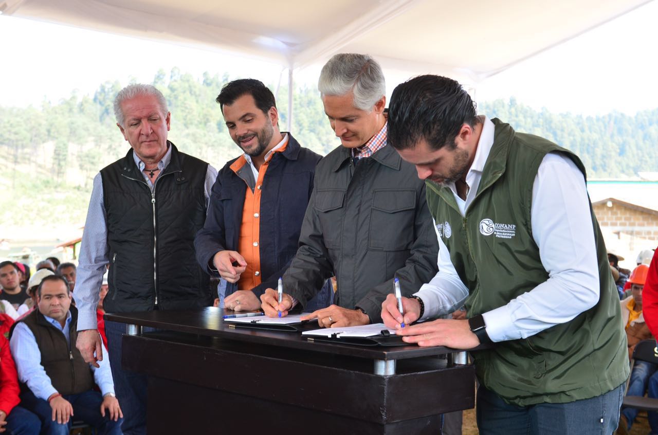 Amanalco, Estado de México, 22 de febrero de 2018.- El gobernador Alfredo Del Mazo Maza, el Secretario de Medio Ambiente y Recursos Naturales federal, Rafael Pacchiano Alamán, y el Comisionado Nacional de Áreas Naturales Protegidas, Alejandro Del Mazo, firmaron tres convenios de colaboración para mejorar el cuidado de los bosques y áreas naturales protegidas en la entidad y preservar los beneficios ambientales que estas regiones brindan.
