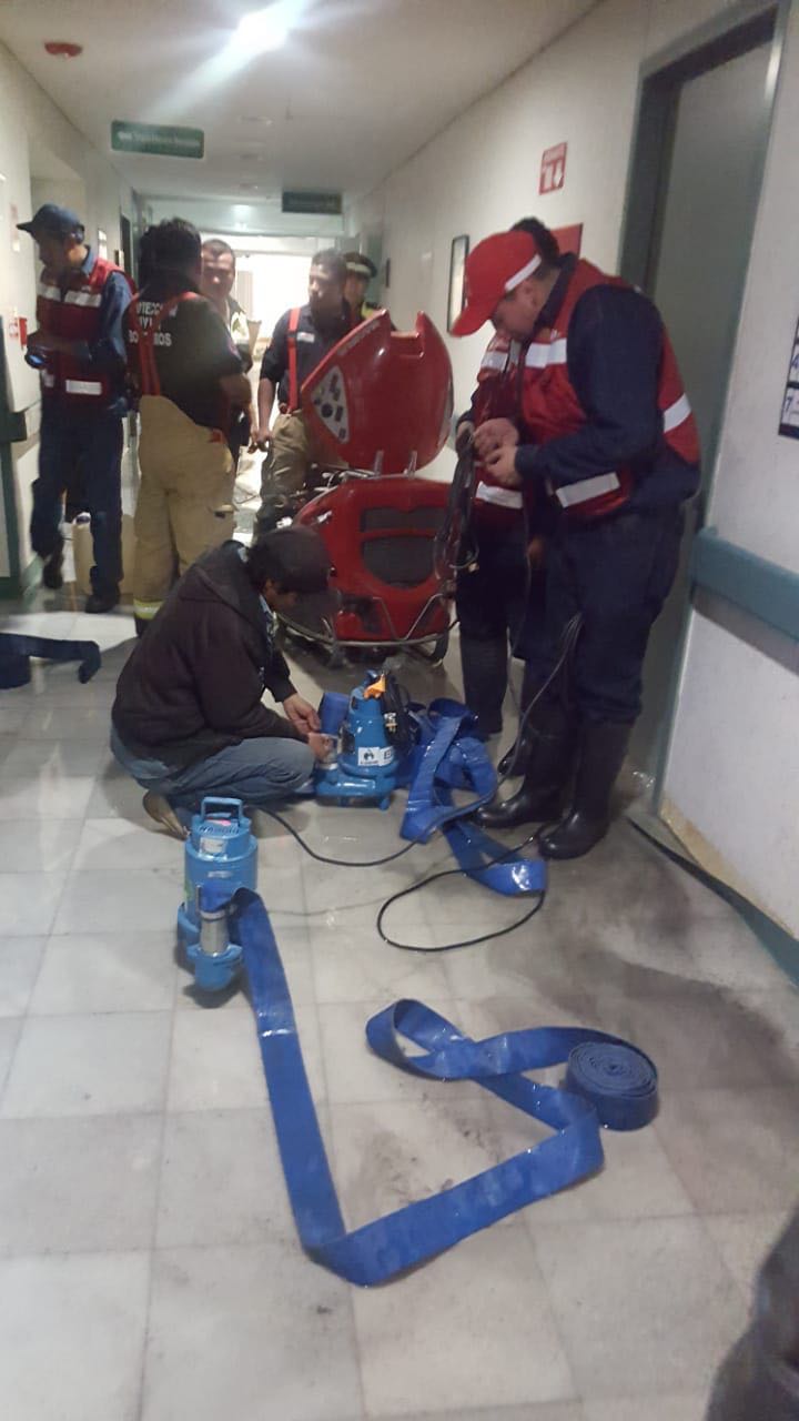 Fueron enviadas dos brigadas del Departamento de Agua Limpia de la Comisión de Agua del Estado de México (CAEM) para llevar a cabo maniobras de desinfección en el inmueble afectado; asimismo, se encuentra desazolvada la mayor parte de las áreas afectadas del nosocomio. Se estima que esta situación se regularizará en unas horas.