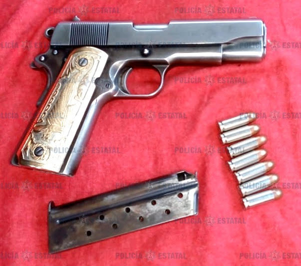 Tras marcarles el alto y efectuar la revisión correspondiente, se localizó en el piso de la camioneta una pistola tipo escuadra marca Colt, calibre 38 Súper, con cachas doradas, y un cargador abastecido con seis cartuchos útiles.