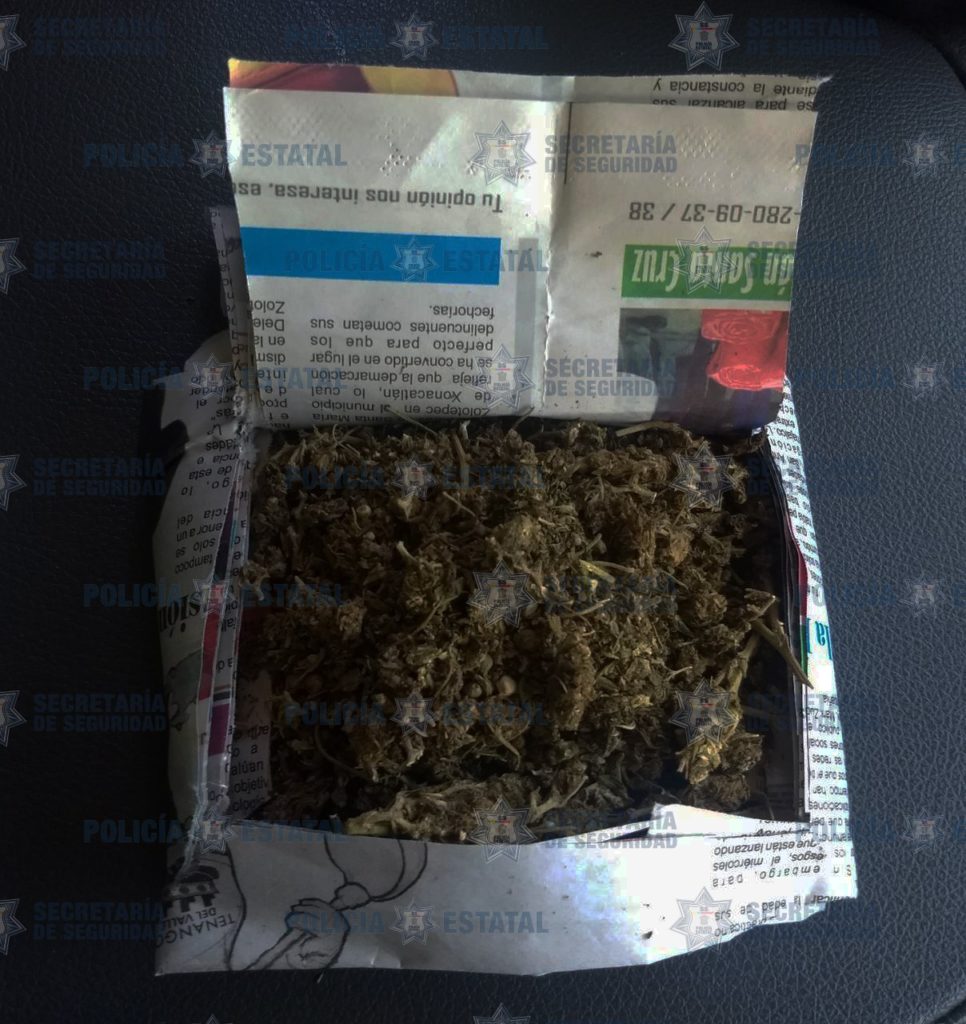 Derivado de su actitud nerviosa y evasiva, los uniformados le solicitaron su consentimiento para una revisión de rutina, y el indiciado sacó de entre sus pertenencias una bolsa con aproximadamente 90 gramos de hierba verde seca, con las características propias de la marihuana.