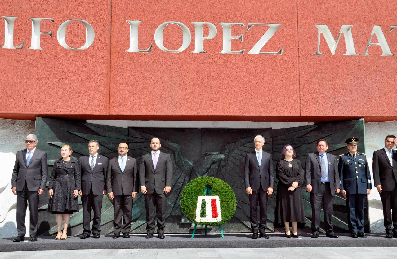 Al término del evento, encabezados por el titular del Ejecutivo estatal, familiares y funcionarios realizaron una guardia solemne de honor y depositaron una ofrenda floral en el Mausoleo dedicado a Adolfo López Mateos.