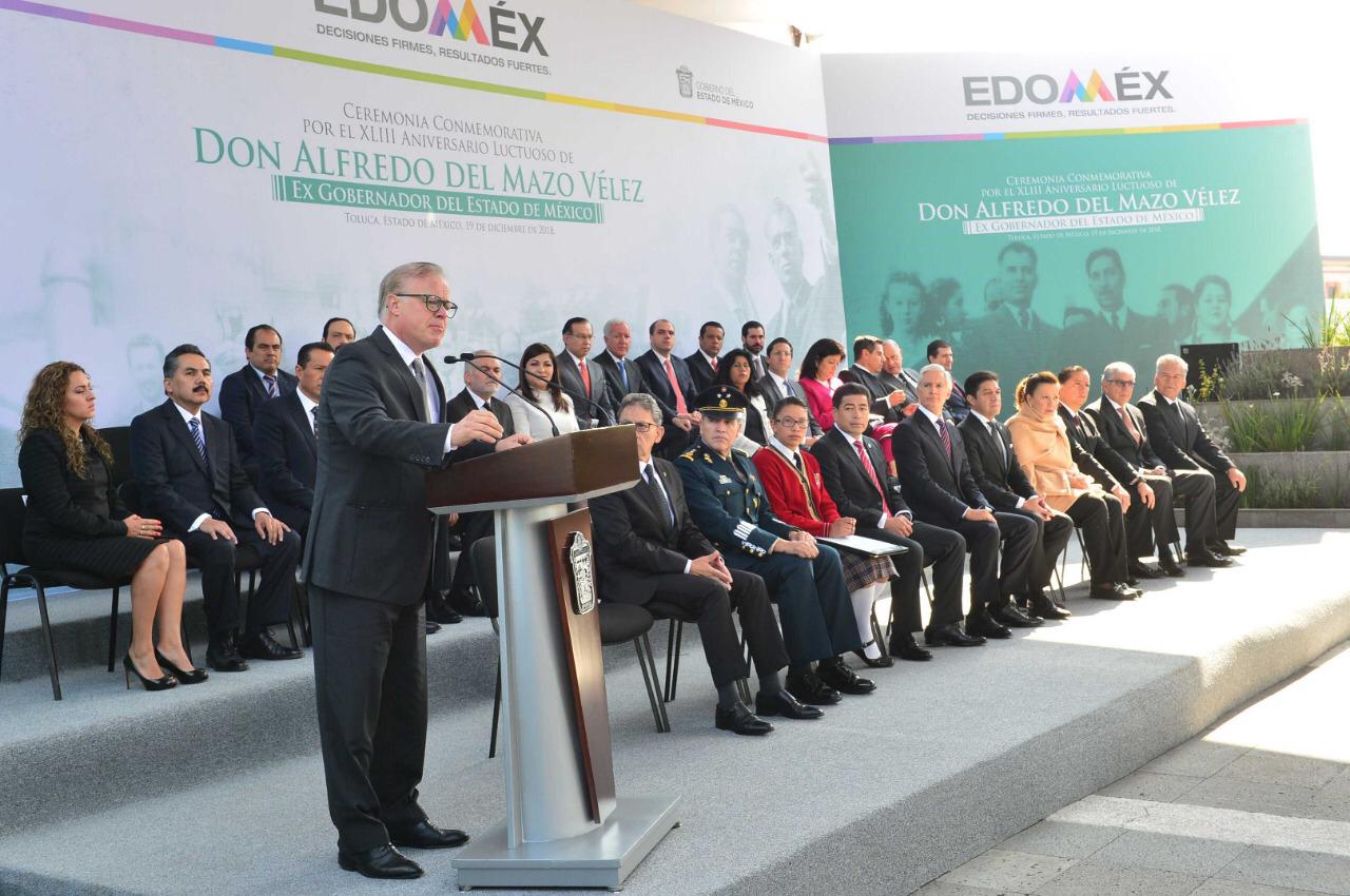 “A 43 años de la muerte de Alfredo Del Mazo Vélez, estamos aquí para evocar las virtudes de uno de los hijos destacados de nuestra patria chica, uno de los conductores del progreso estatal y, desde luego, fuente de inspiración de varias generaciones. Honrar su memoria es convertir sus valores y convicciones en lección moral para quienes nos dedicamos a servir”, apuntó.