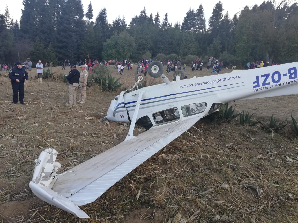 Zinacantepec, Estado de México, 9 de febrero de 2019. La Coordinación General de Protección Civil del Estado de México reportó la caída de una aeronave con matrícula XB-OZF de la escuela de Capacitación Aérea Integral, SC, Toluca Estado de México, en el paraje Los Pocitos, Barrio de Mexico, de la comunidad de Santa María del Monte, ubicado en el municipio de Zinacantepec.