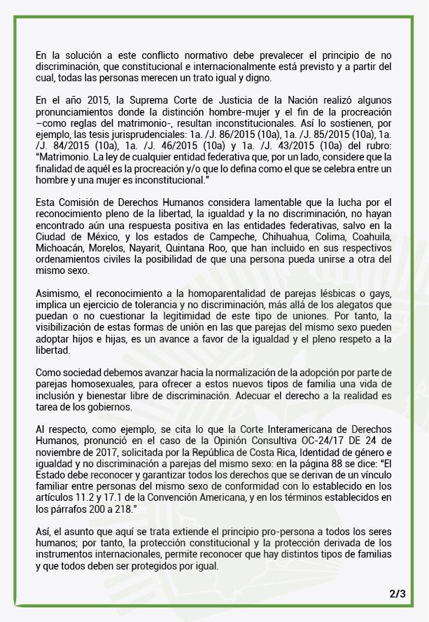 La Codhem considera lamentable que la lucha por el reconocimiento pleno de la libertad, la igualdad y la no discriminación, no hayan encontrado aún una respuesta positiva en las entidades federativas, salvo en la Ciudad de México, y los estados de Campeche, Chihuahua, Colima, Coahuila, Michoacán, Morelos, Nayarit, Quintana Roo, que ya incluyeron en sus respectivos ordenamientos civiles la posibilidad de que una persona pueda unirse a otra del mismo sexo.