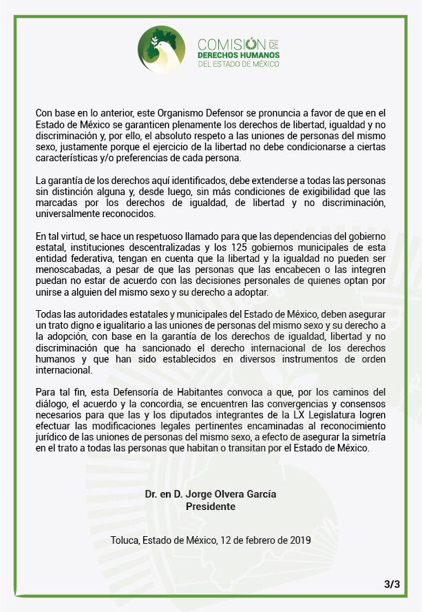 A través de un documento firmado por el ombudsperson Jorge Olvera García, la Comisión de Derechos Humanos del Estado de México (Codhem) convoca a que, por los caminos del diálogo, el acuerdo y la concordia, se encuentren las convergencias y consensos necesarios para que las y los diputados de la LX Legislatura efectúen las modificaciones legales pertinentes encaminadas al reconocimiento jurídico de las uniones de personas del mismo sexo, a efecto de asegurar la simetría en el trato a quienes habitan o transitan por la entidad mexiquense.