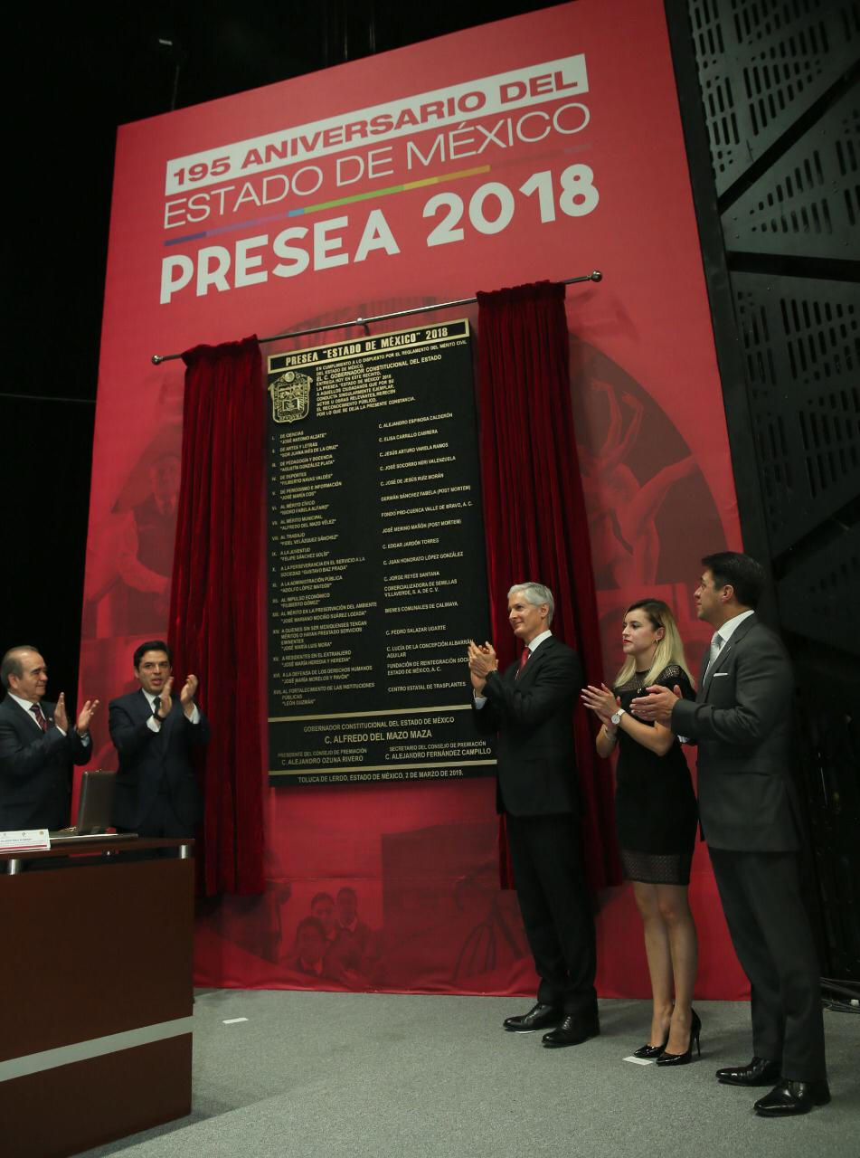 Toluca, Estado de México, 2 de marzo de 2019. Durante el 195 aniversario de la fundación de la entidad, el Gobernador Alfredo Del Mazo Maza entregó la Presea Estado de México 2018, mayor reconocimiento que la sociedad mexiquense hace a los ciudadanos cuyas aportaciones contribuyen al desarrollo del estado, y subrayó que esta entrega es un premio al espíritu, la creatividad y la determinación que distinguen a la tierra mexiquense.