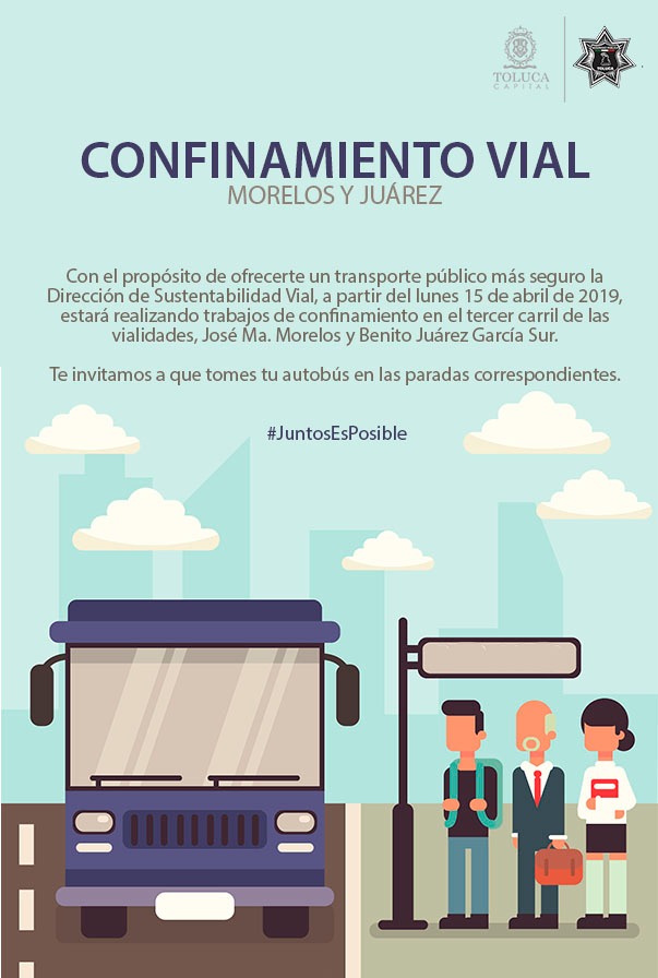 Toluca, México, domingo 14 de abril de 2019.- A partir de este lunes 15 de abril, el gobierno municipal de Toluca, a través de la Dirección General de Seguridad Pública, instrumentará acciones de confinamiento vial encaminadas a que el transporte público circule exclusivamente sobre el carril izquierdo. Dichas acciones se llevarán a cabo en las avenidas José María Morelos y Benito Juárez del primer cuadro de la ciudad.