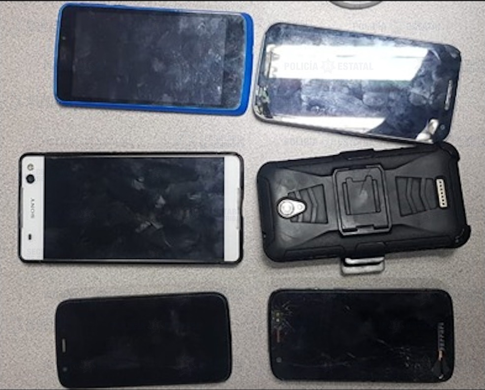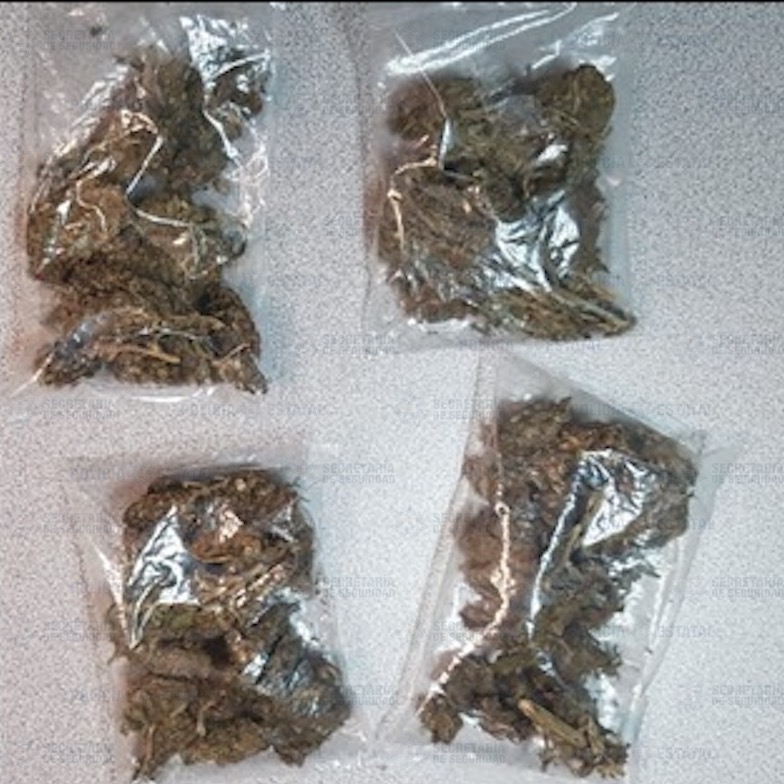 Tras una revisión apegada al protocolo de actuación entre las pertenencias de los implicados se localizaron cuatro bolsas de plástico transparente con una hierba verde de características similares a la marihuana, además de seis celulares.