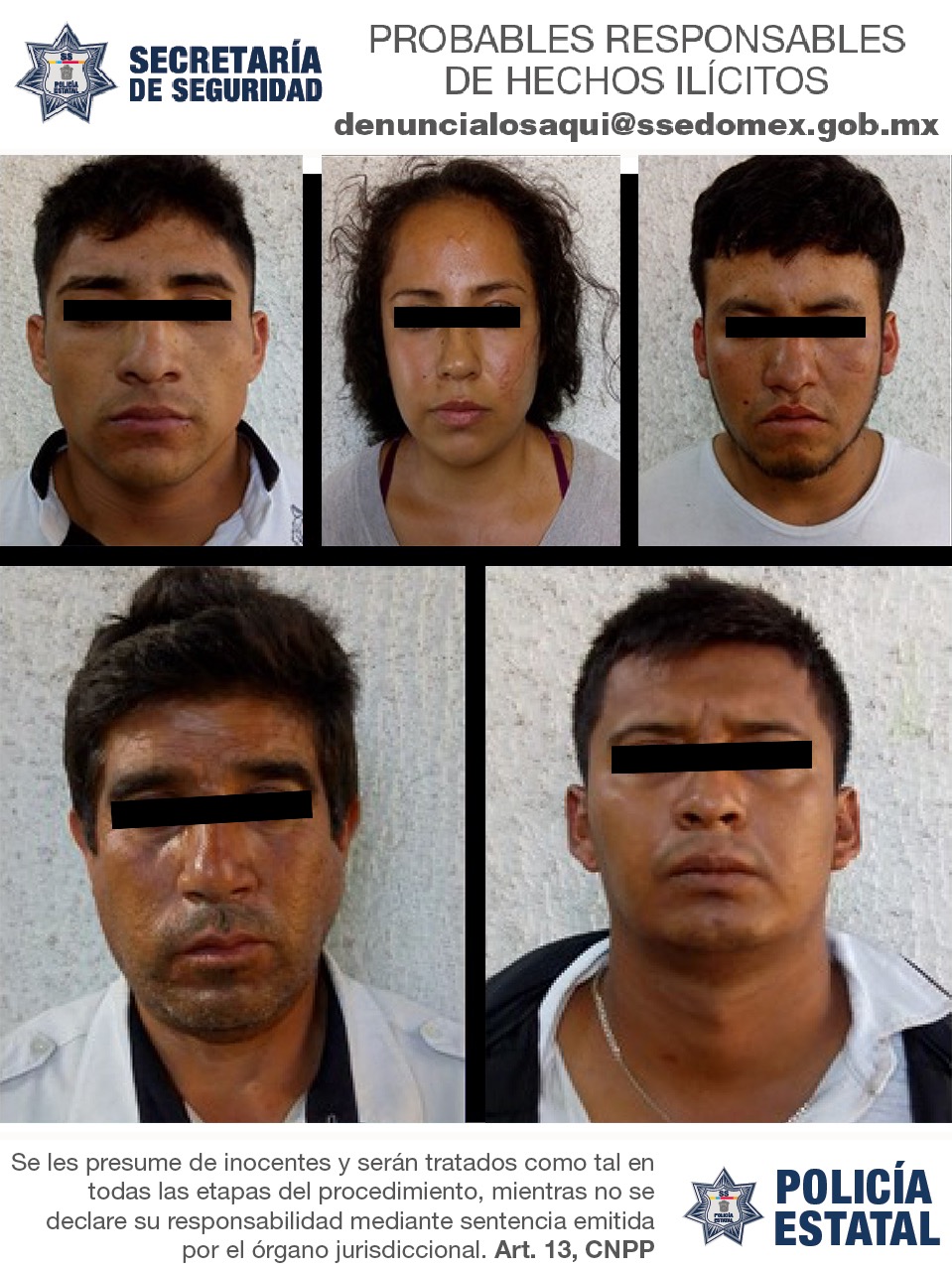 En acción inmediata, los efectivos de ambas corporaciones iniciaron la persecución donde momentos más tarde capturaron a José Pedro de 27 años de edad; Daniel “N”, de 27 años; Fernando “N”, de 44 años; Judá “N”, de 21 años y María Susana “N” de 24 años de edad.