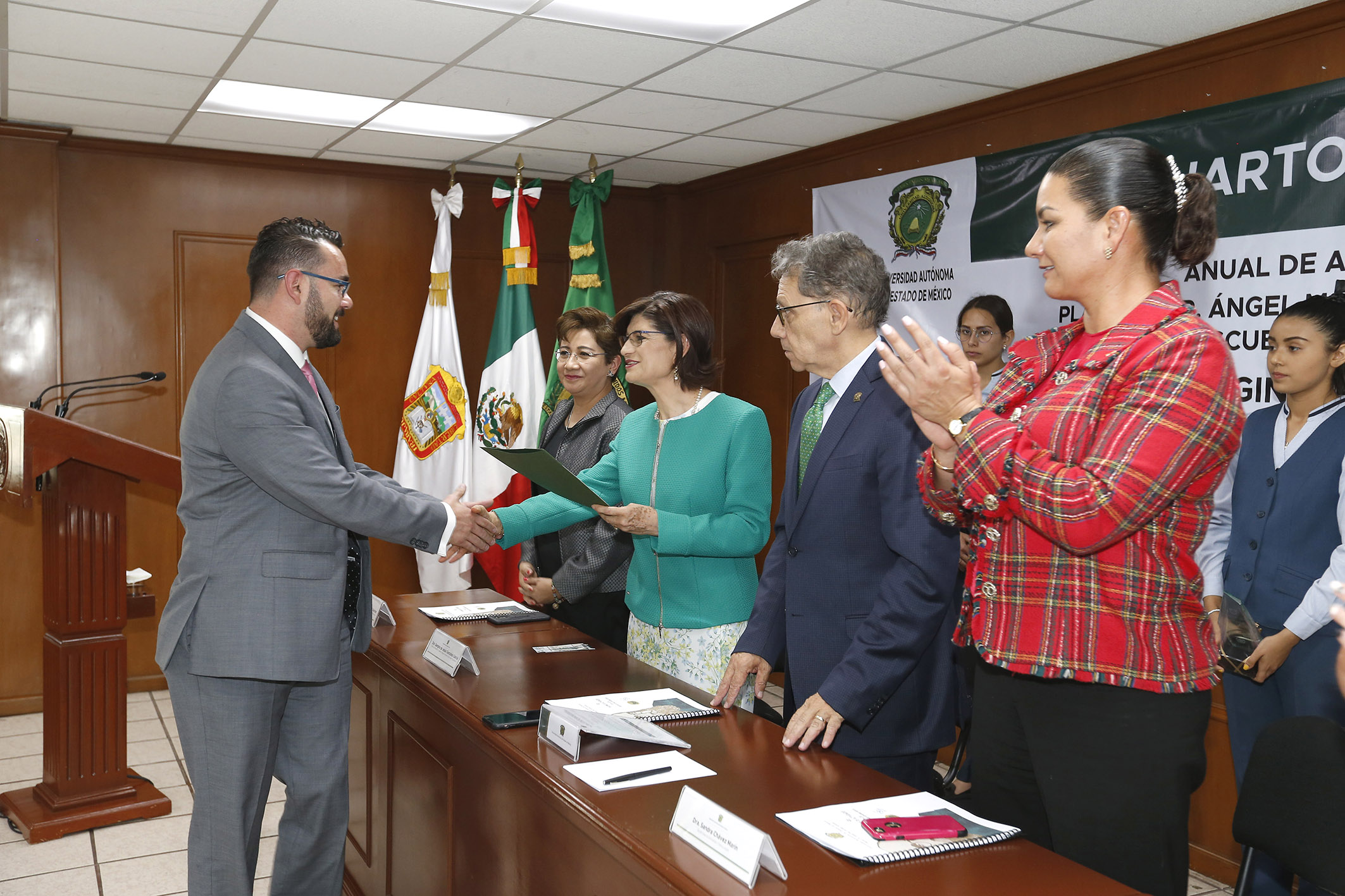 Toluca, México, 27 de mayo de 2019. La Universidad Autónoma del Estado de México materializa las esperanzas sociales de los mexiquenses, al mejorar su cobertura y servicios educativos y formar más estudiantes con mayor calidad, sostuvo el rector Alfredo Barrera Baca, al presidir el cuarto informe de actividades de la directora del Plantel “Dr. Ángel María Garibay K.” de la Escuela Preparatoria, Georgina de Jesús González García.
