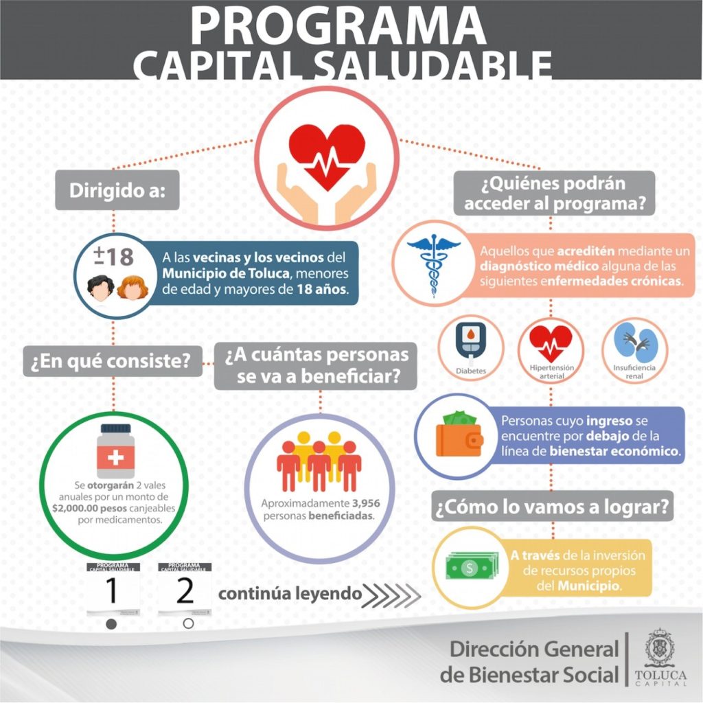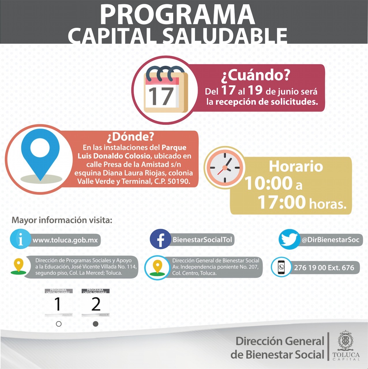 Toluca, Estado de México, sábado 15 de junio de 2019.- Con el objetivo de apoyar a la población toluqueña que padece enfermedades crónicas, como diabetes, hipertensión arterial e insuficiencia renal, la Dirección General de Bienestar Social convoca a participar en la selección del programa Capital Saludable, que ayudará a los beneficiarios con vales para la adquisición de medicamentos.