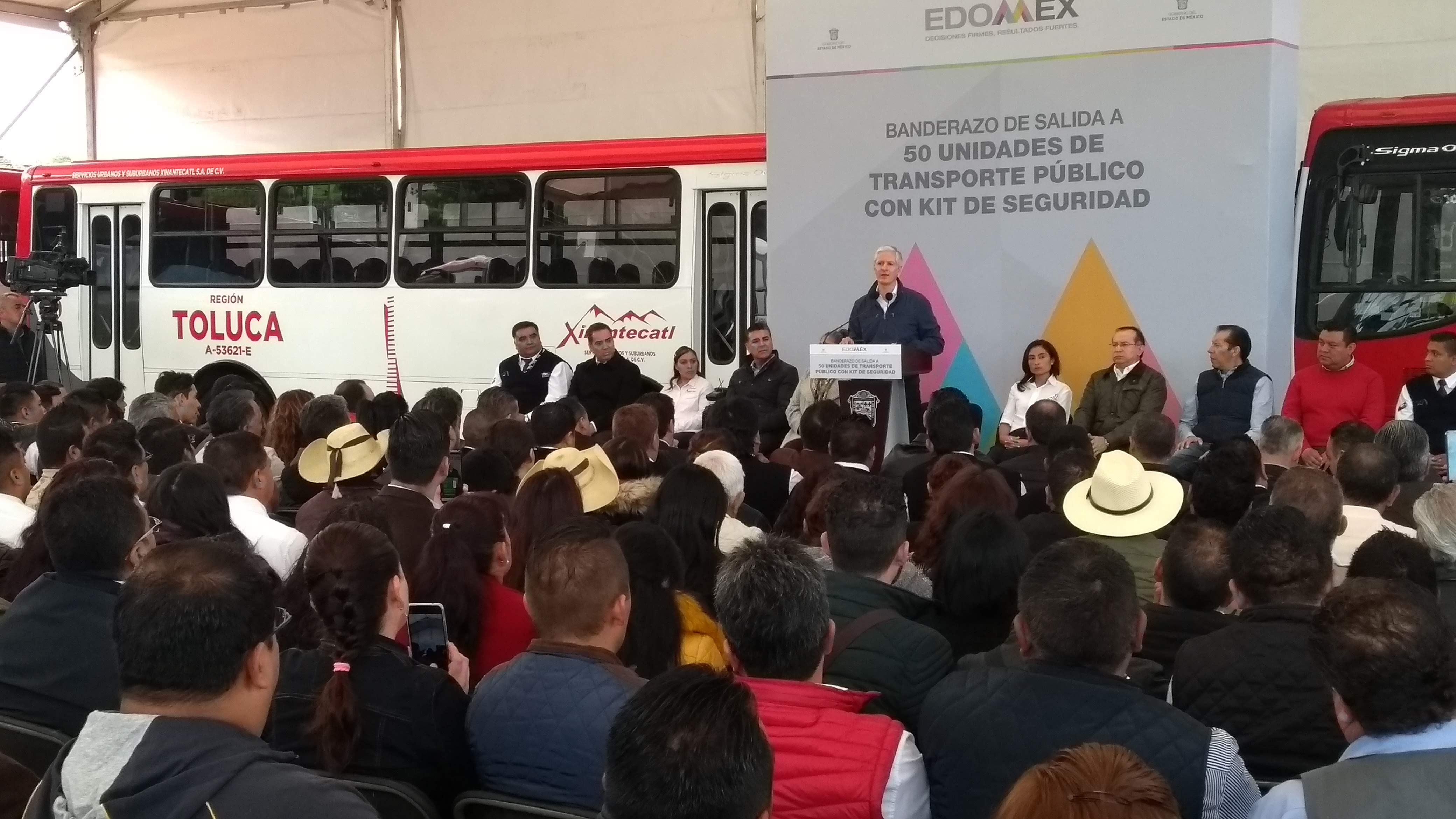 Al dar el banderazo de salida a 50 unidades de transporte que operan en el Valle de Toluca, equipadas con sistemas de seguridad y tecnología amigable con el medio ambiente, el mandatario mexiquense subrayó que la inseguridad es el mayor reto en la actualidad y dijo que para hacer frente a este problema durante su administración se han realizado 657 operativos, además de continuar fortaleciendo las medidas para evitar delitos en el transporte.