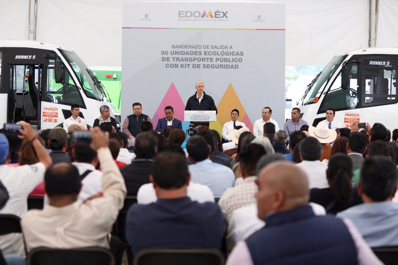 Nicolás Romero, Estado de México, 1 de julio de 2019. En el Estado de México se apuesta por tener una movilidad integral que brinde seguridad a las personas y cuide del medio ambiente, por lo que continuamos con la modernización del sistema de transporte público en beneficio de los habitantes de esta entidad, afirmó el Gobernador Alfredo Del Mazo Maza al dar el banderazo de salida a 90 unidades ecológicas de transporte público con kit de seguridad.