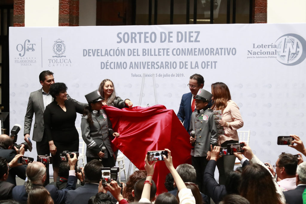 Toluca, Estado de México, viernes 5 de julio de 2019.- La Orquesta Filarmónica de Toluca (OFiT) celebra su décimo aniversario con la emisión de un billete conmemorativo de la Lotería Nacional, que con tres millones 200 mil cachitos recorrerá el país mostrando el patrimonio artístico y cultural de la capital.