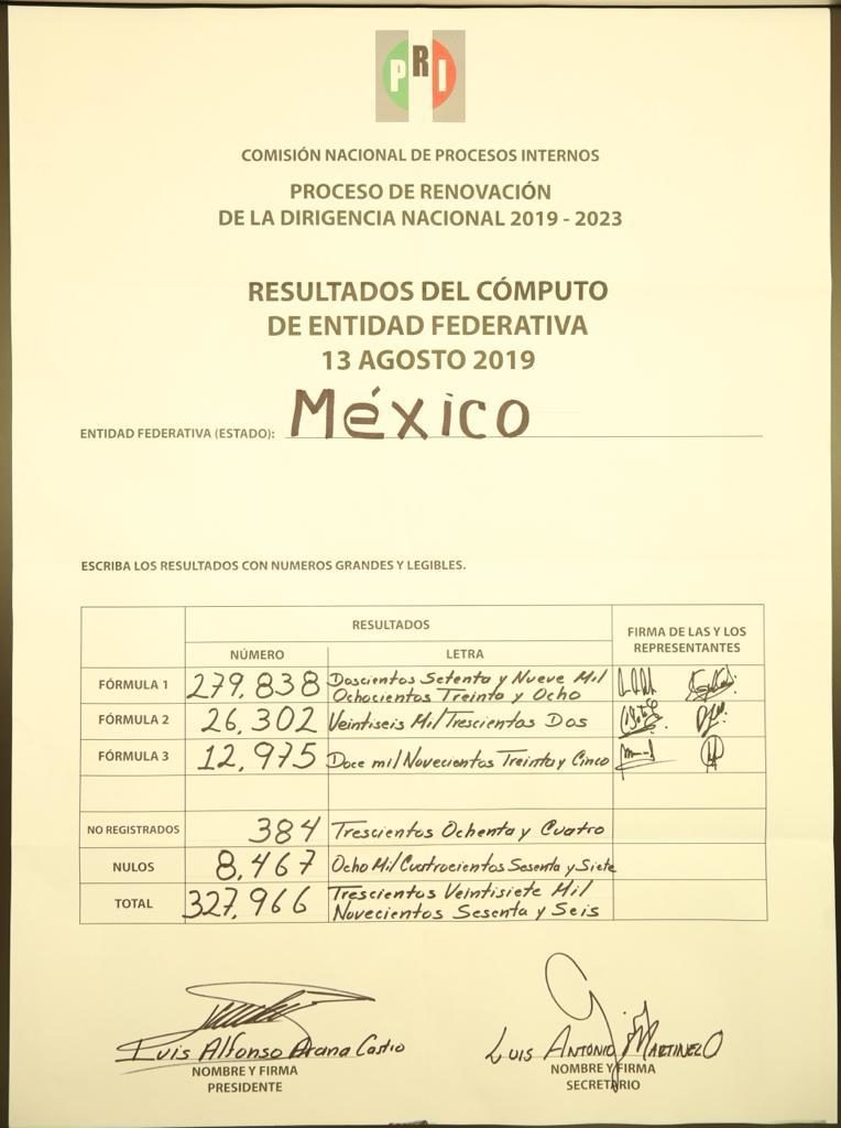 dirigencia del Comité Ejecutivo Nacional del Partido Revolucionario Institucional (PRI), obtuvo 279 mil 838 votos en el Estado de México, en la elección realizada el pasado 11 de agosto.