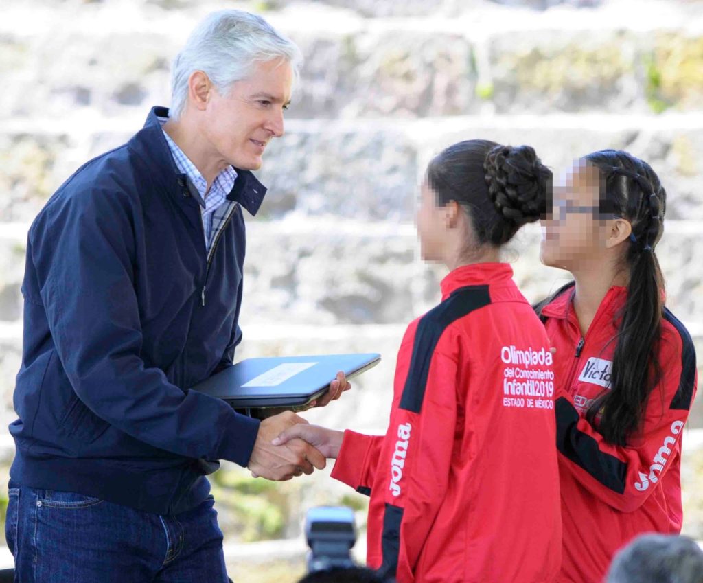 La zona arqueológica de Teotenango fue el escenario donde el mandatario estatal también entregó cheques, vales por laptop y kits escolares a los 74 estudiantes de sexto de primaria que obtuvieron los primeros lugares en la Olimpiada del Conocimiento Infantil 2019, en la cual participaron más de 300 mil alumnas y alumnos mexiquenses de ese grado.