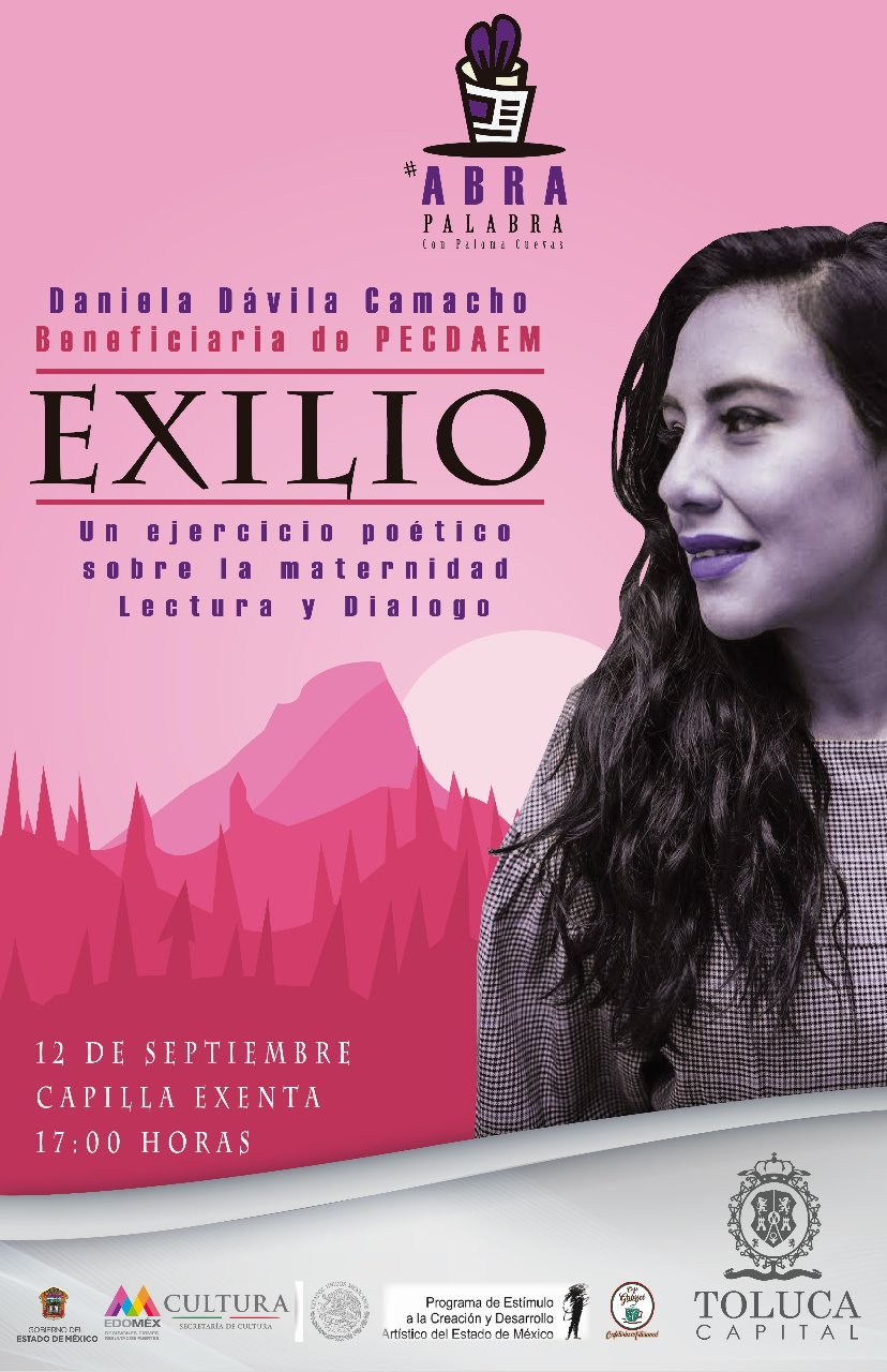 En este contexto, la Dirección de Cultura invita este jueves 12 de septiembre a las 17:00 horas en la Capilla Exenta de Toluca, al programa de fomento a la lectura y la literatura #AbraPalabra, que contará con la presencia de la escritora y locutora Daniela Dávila, quien presentará su proyecto Vientre Malva, seleccionado por el Programa de Estímulo a la Creación y Desarrollo Artístico del Estado de México (PECDA), que inició como un poemario para abordar la experiencia de la primera maternidad y busca reivindicar la figura femenina.