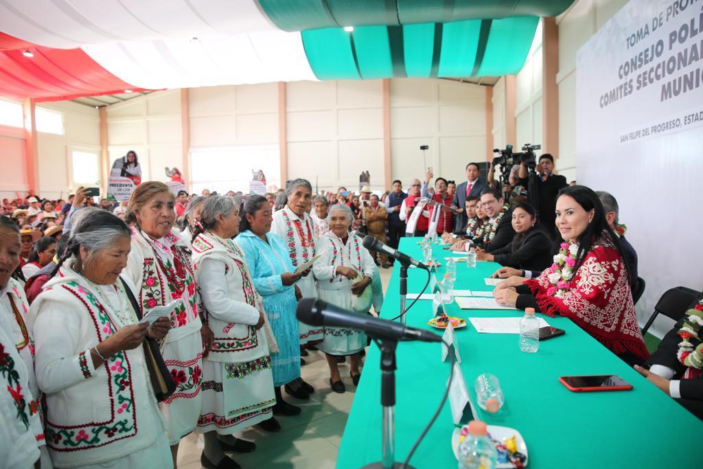 En San Felipe del Progreso, donde rindieron protesta Edgar Romero López y Zenaida Cruz Turcios, como presidente y secretaria general, respectivamente, del Comité Municipal, Del Moral Vela fue bienvenida con el corrido Mujeres Hermosas, a cargo de 20 cantantes mazahuas del grupo la Purísima Concepción de Mayorazgo.