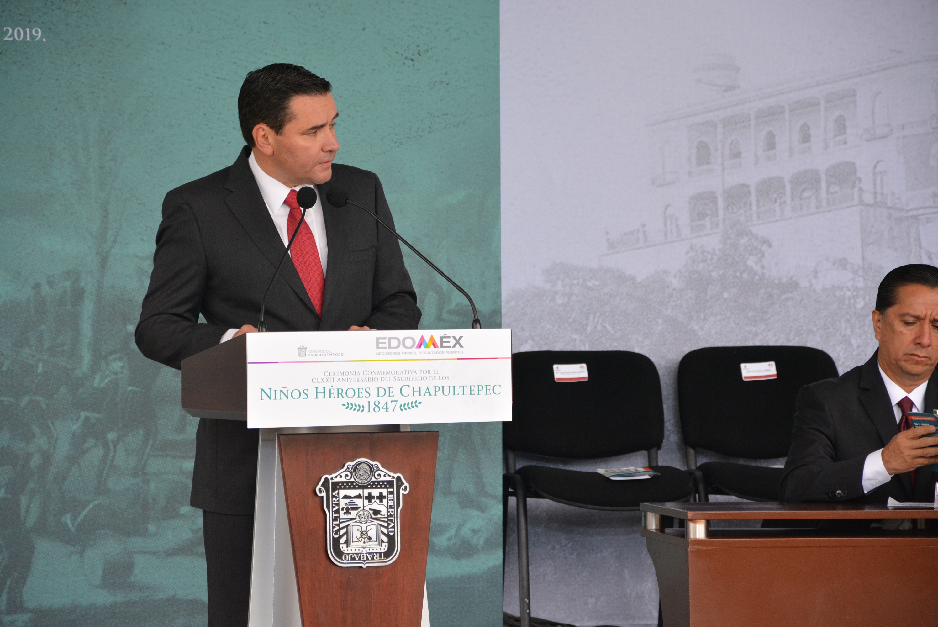 Al pronunciar el mensaje oficial por el CLXXII Aniversario de la Gesta Heroica de los Niños de Chapultepec, a nombre de los tres poderes del Estado de México, el Secretario de Educación, Alejandro Fernández Campillo, señaló que el ejemplo, valor y sacrificio mostrado por los cadetes que ofrendaron su vida por la patria, nos obliga a entregarles a los jóvenes de hoy una nación unida, con un mejor porvenir.