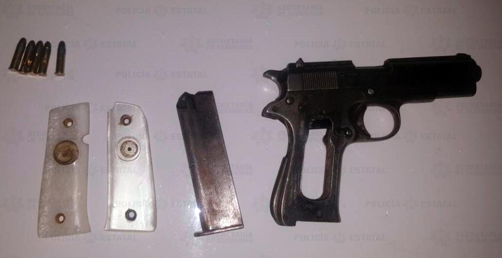 Acorde al protocolo de actuación, los uniformados efectuaron la inspección preventiva a sus pertenencias; al concluir, fue posible asegurar un arma de fuego, tipo pistola, calibre 22 milímetros, marca “Llama” especial con cinco cartuchos útiles, con las mismas características a la utilizada durante los asesinatos, mismos que se presume fueron ejecutados por diferencias con la venta de estupefacientes.