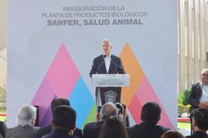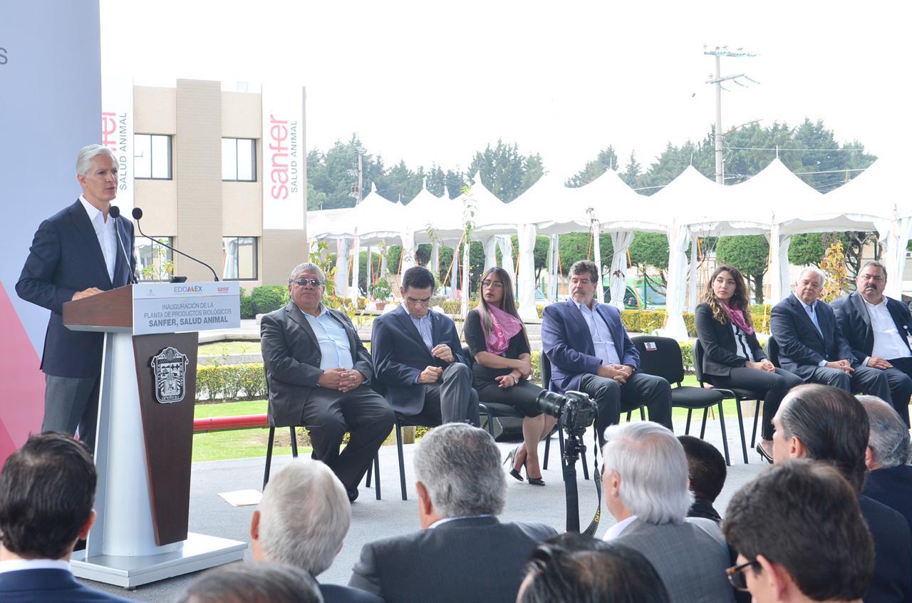 Esto fue en el acto inaugural de del sexto centro de operaciones de la empresa SANFER, que produce biológicos para la salud animal. Destacó que se trata de una inversión importante para el Estado de México, el sector farmacéutico y para Santiago Tianguistenco, pues asciende a 450 millones de pesos y producirá un millón de vacunas al año, con lo que asume el liderazgo a nivel internacional, y adicionalmente, recibirá de Quebec City View, otros 500 millones de dólares para su desarrollo.