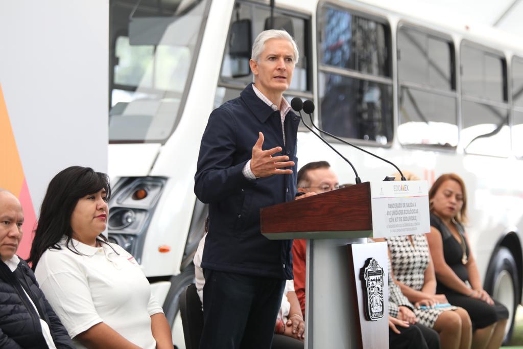 Del Mazo también informó que suman 43 mil unidades de transporte renovadas en el estado en lo que va de la administración, las cuales se han sustituido por unidades más modernas, además que también se regularizaron 96 mil concesiones para la correcta operación de estas unidades.