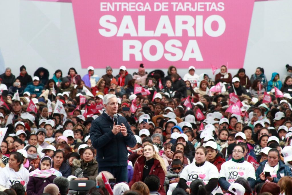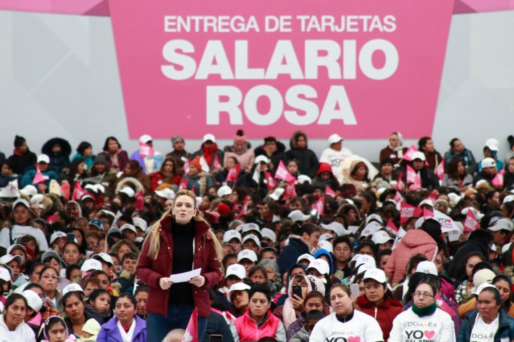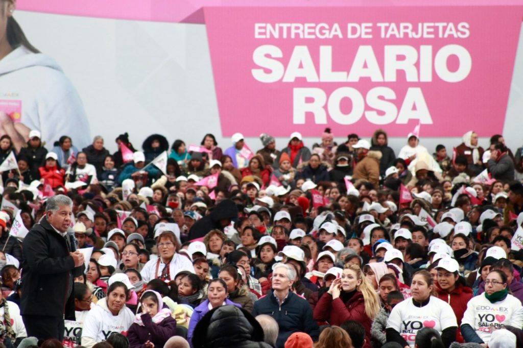 El mandatario mexiquense, junto con su esposa Fernanda Castillo de Del Mazo, entregó tarjetas del Salario rosa, a cerca de 7 mil mujeres de los 125 municipios de la entidad, quienes tienen un hijo o familiar cercano con discapacidad, y aseguró que ellas trabajan cada día para sacar adelante a sus familias, pero aquellas que tienen algún pariente con una limitante, deben hacer un esfuerzo mayor.