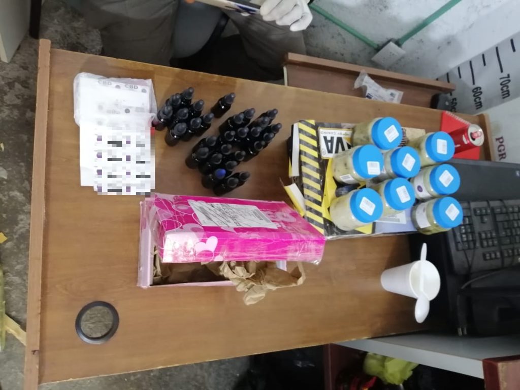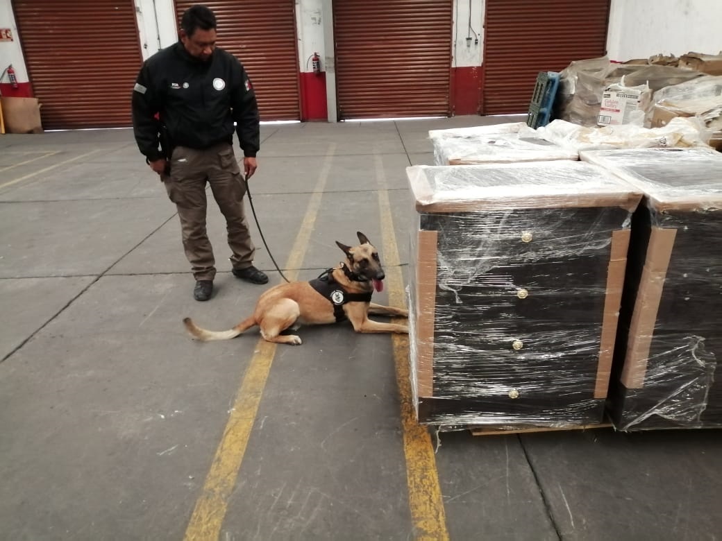 Durante la revisión el canino modificó su conducta sobre unos cajones de madera, donde los elementos policiales localizaron escondidos 64 paquetes y 36 frascos con la droga.