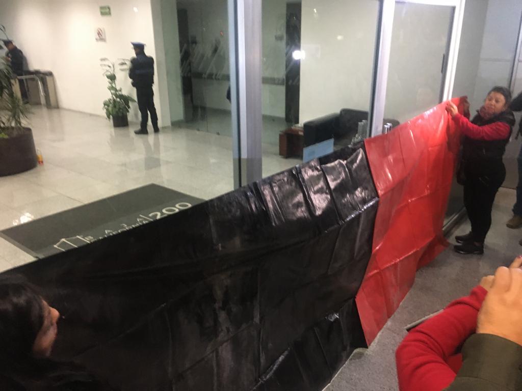 Ante representantes de Derechos Humanos, de organismos internacionales, medios de comunicación y defensores de derechos humanos, fueron instaladas las banderas rojinegras en las puertas de entrada de Notimex.