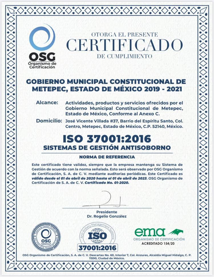 El Organismo de Certificación OSG, luego de auditorías periódicas, otorgó al gobierno municipal de Metepec la acreditación de cumplimiento del Sistema de Gestión Antisoborno ISO 37001:2016, con vigencia hasta el primero de abril del 2023.