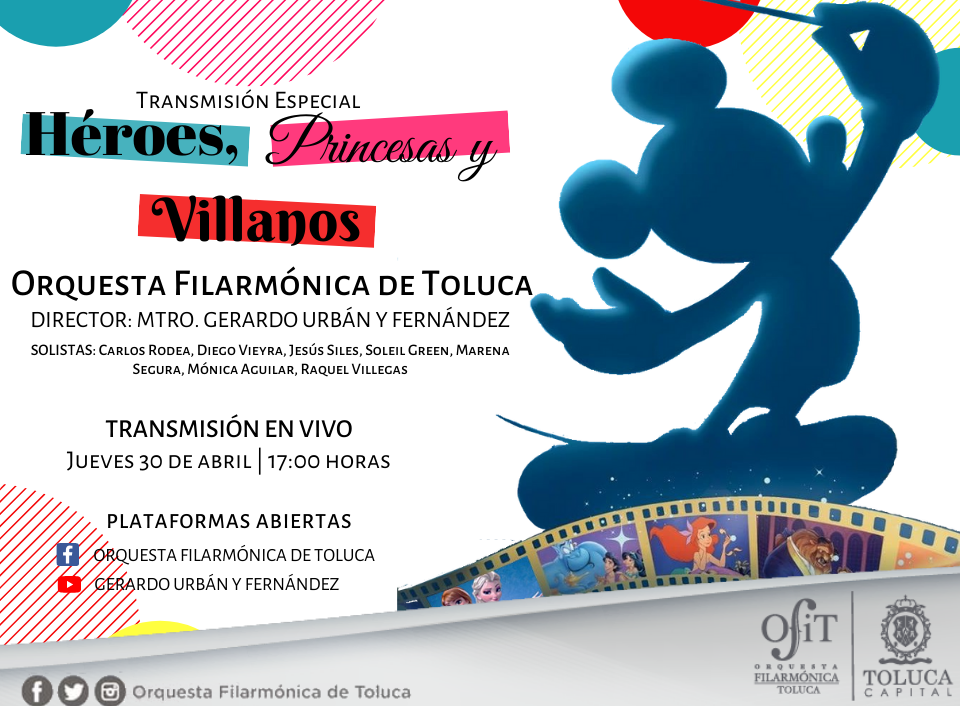 Asimismo, la Orquesta Filarmónica de Toluca (OFiT) celebrará a los pequeños con la transmisión especial del concierto Héroes, princesas y villanos, con música de Disney, el jueves 30 de abril a las 17:00 horas, en el que además de los talentosos músicos bajo la dirección del maestro Gerardo Urbán y Fernández participan los solistas Carlos Rodea, Diego Vieyra, Jesús Siles, Soleil Green, Marena Segura, Mónica Aguilar y Raquel Villegas.