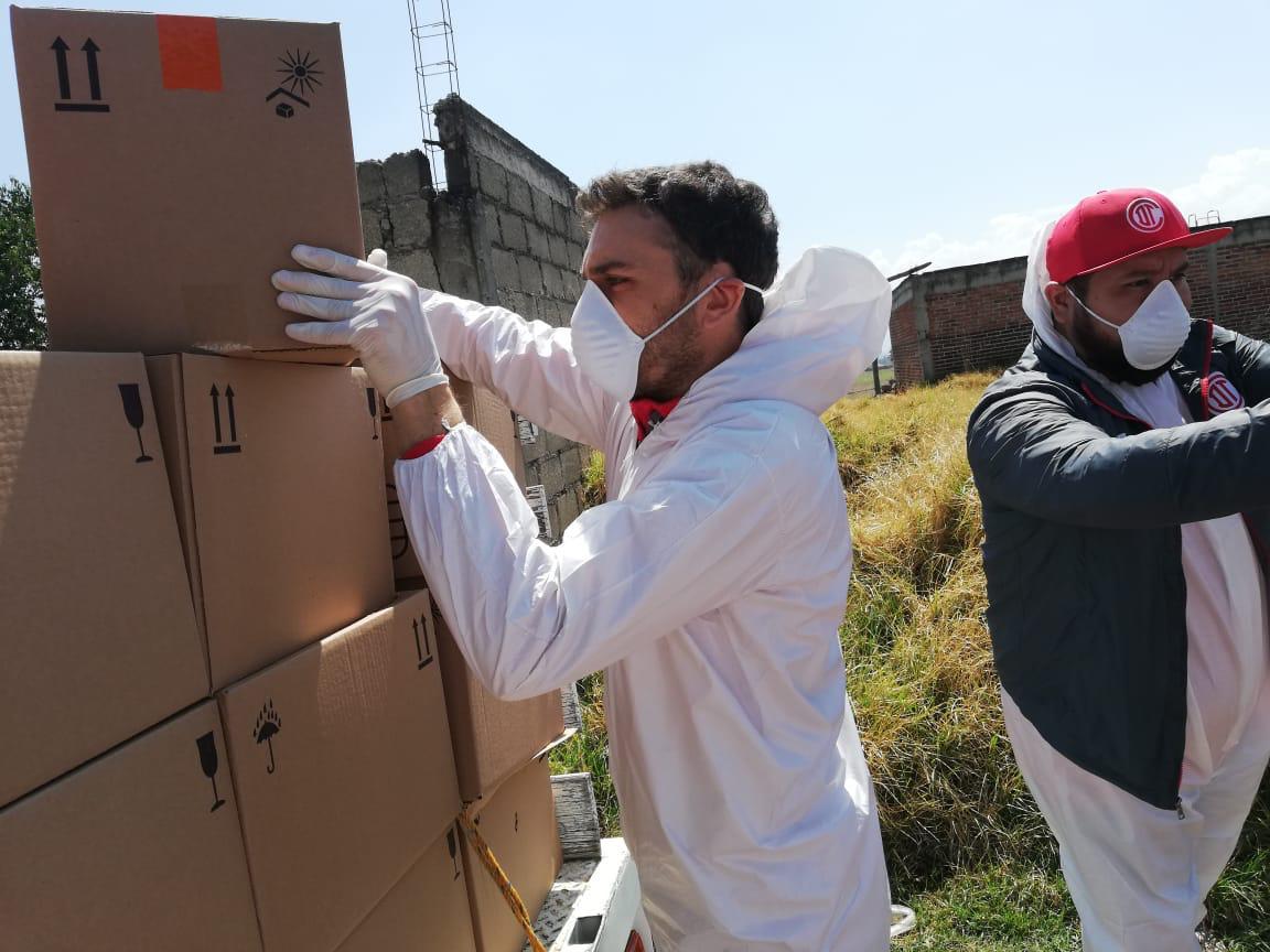 Metepec, México; 01 de mayo de 2020. Jugadores del Club Deportivo Toluca con el apoyo de la directiva de esa institución deportiva, entregaron con representantes del gobierno de la alcaldesa Gaby Gamboa Sánchez, apoyos alimentarios a población en condición vulnerable.
