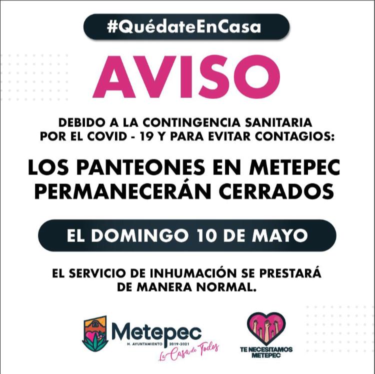 Metepec, México, 06 de mayo de 2020. El gobierno de Metepec informó que el próximo domingo 10 de mayo, los 11 panteones ubicados en esta demarcación permanecerán cerrados.
