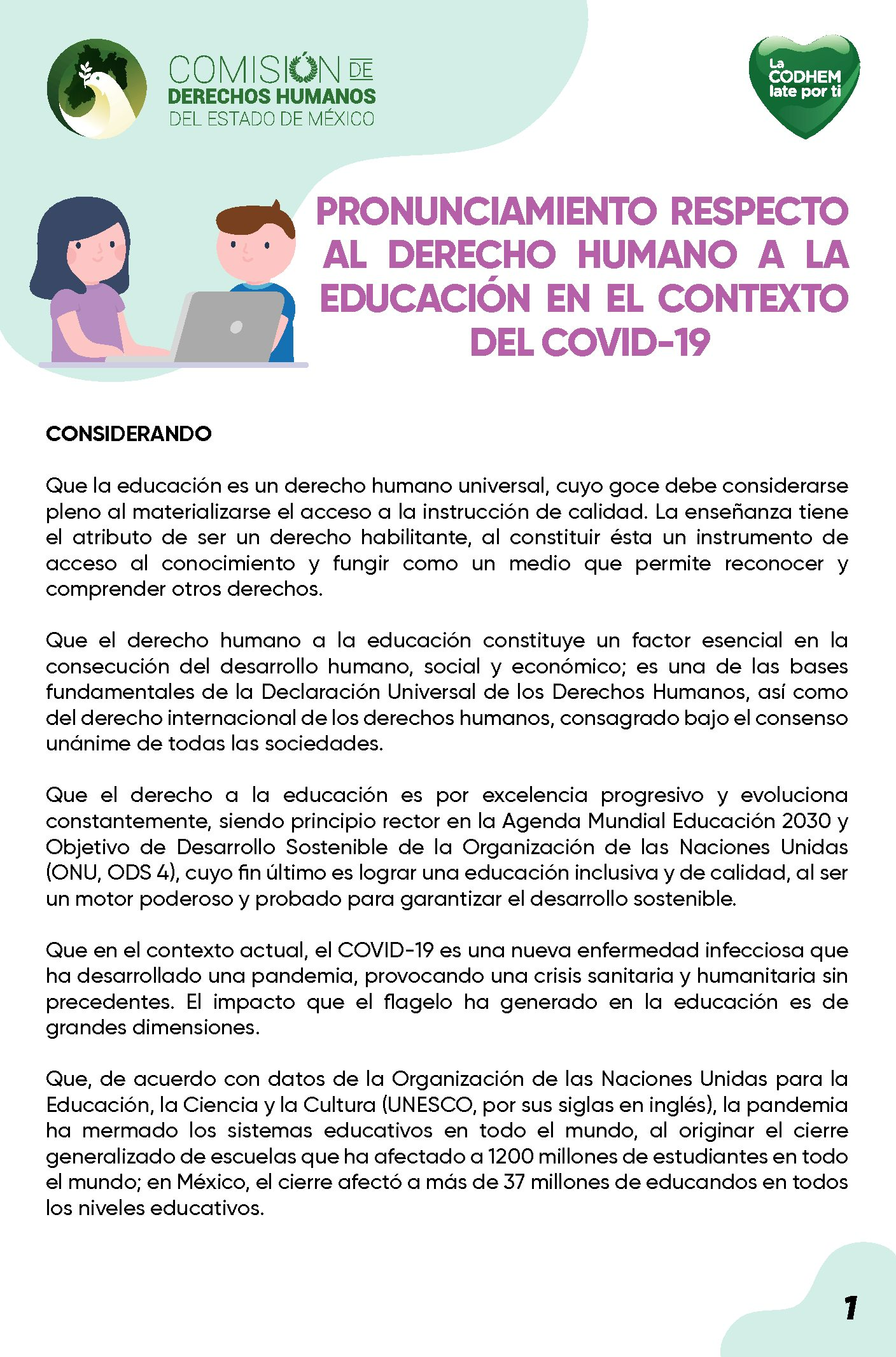 En el documento firmado por el presidente de la Codhem, el Dr. Jorge Olvera García, se expone la importancia del derecho a la educación, el impacto de la pandemia por COVID-19 en las y los estudiantes de los diversos niveles educativos, así como la necesidad de medidas preventivas aplicadas para evitar contagios y las acciones efectuadas por la Codhem en la materia.