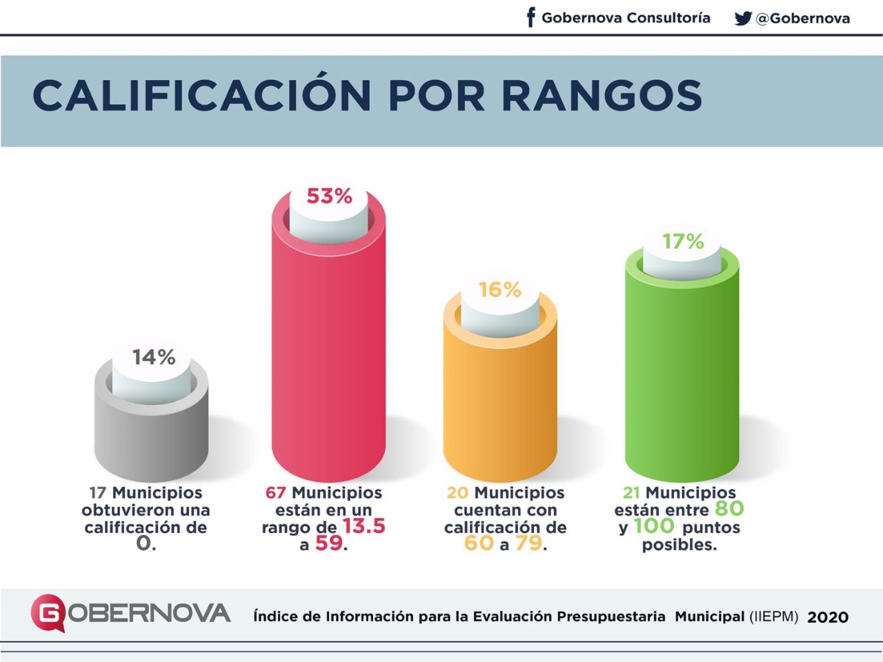 Fueron 21 municipios los que obtuvieron calificación entre 80 y 100 puntos; 20 municipios, entre 60 y 79; 67 municipios, entre 13 y 59 puntos: y 17 municipios con cero puntos al no presentar su Programa Anual de Evaluación.