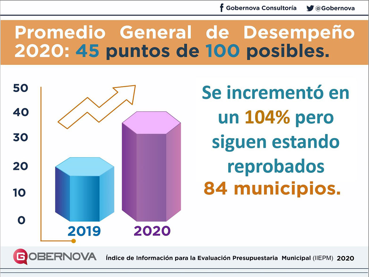 | Aunque mejoraron su desempeño en 2020, los 125 municipios del Estado de México, evaluados por Gobernova, siguen reprobados al conseguir un promedio general de 45 puntos de un total de 100 posibles, informaron en videoconferencia de prensa por Zoom el Director General de Gobernova, Vicente Martínez Iniesta, y los Coordinadores de la Evaluación, Rodrigo Trejo y Marco Antonio Sánchez, quienes destacaron el incremento de mejora al pasar de 22 a 45 puntos en el promedio de calificación general, y recomendaron a la Legislatura Local asumir una mayor participación en seguimiento de la aplicación del gasto y los programas sociales.