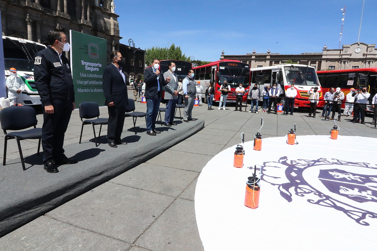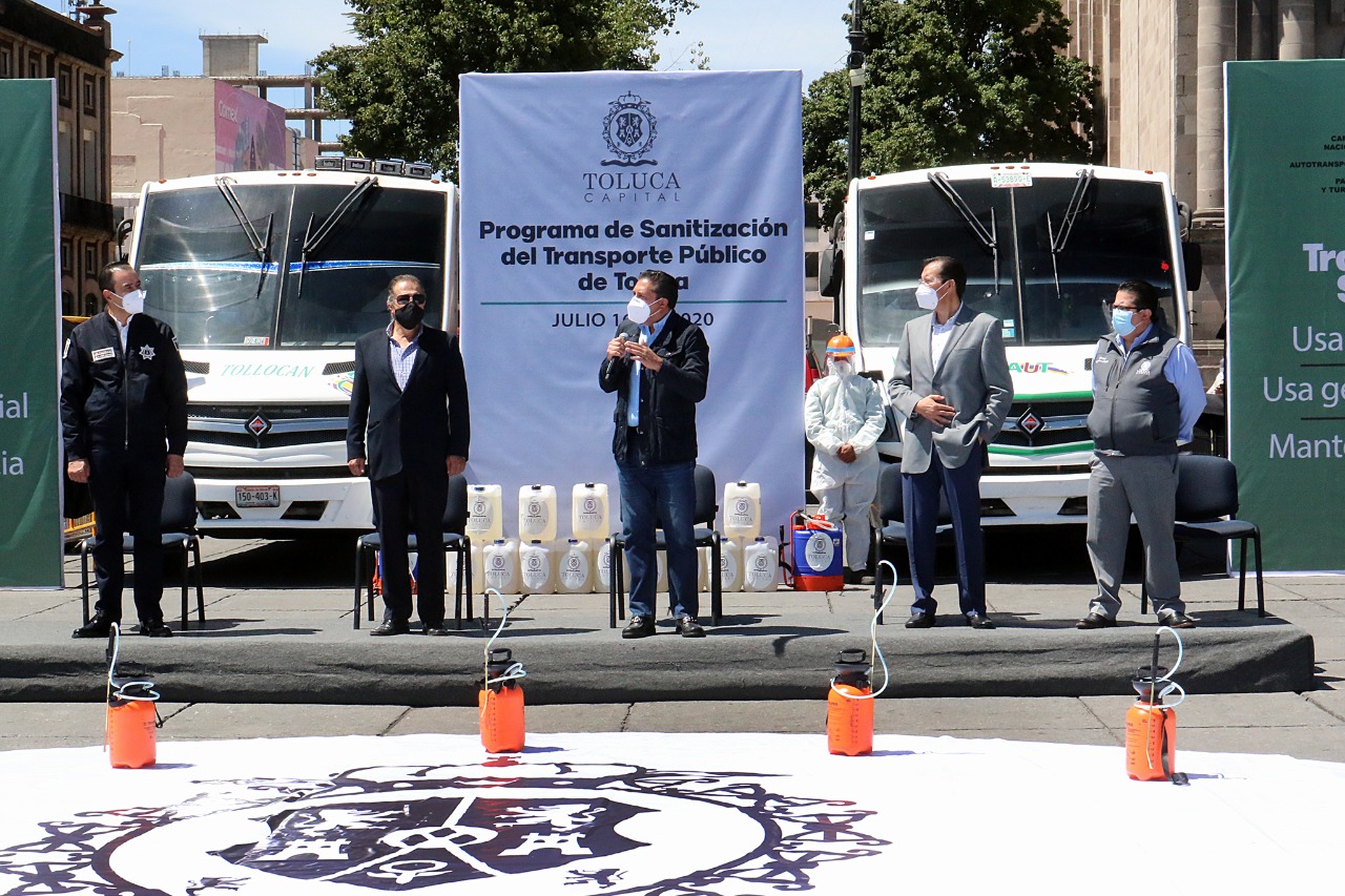 Toluca, Estado de México, jueves 16 de julio de 2020.- Con el objetivo de cuidar la salud de la población comenzó en Toluca el programa Transporte Seguro, con el que el gobierno municipal proporcionará de manera diaria cerca de mil litros de hipoclorito para sanitizar las unidades y prevenir contagios por COVID-19, anunció el alcalde Juan Rodolfo Sánchez Gómez.