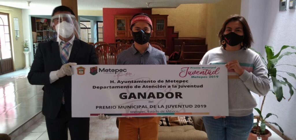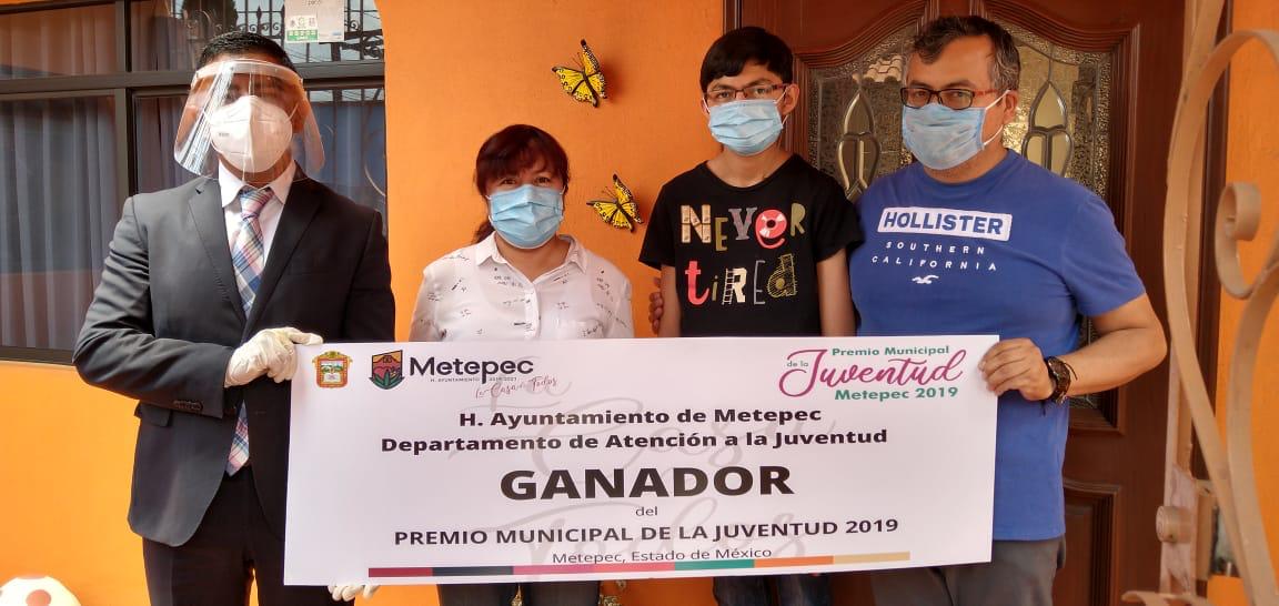 Metepec, México; 31 de julio de 2020. Los 33 ganadores metepequenses del Premio Municipal de la Juventud, recibieron del ayuntamiento el reconocimiento y estímulo económico respectivo hasta la puerta de sus hogares, como parte de las medidas responsables para evitar posible contagio por COVID-19.