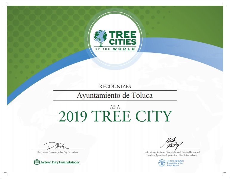 Toluca, Estado de México, viernes 31 de julio de 2020.- El Ayuntamiento de Toluca recibió el reconocimiento internacional “2019 Tree City” por su labor en materia de conservación, mantenimiento y reforestación, llevada a cabo en aras de extender el patrimonio forestal con que cuenta la capital.