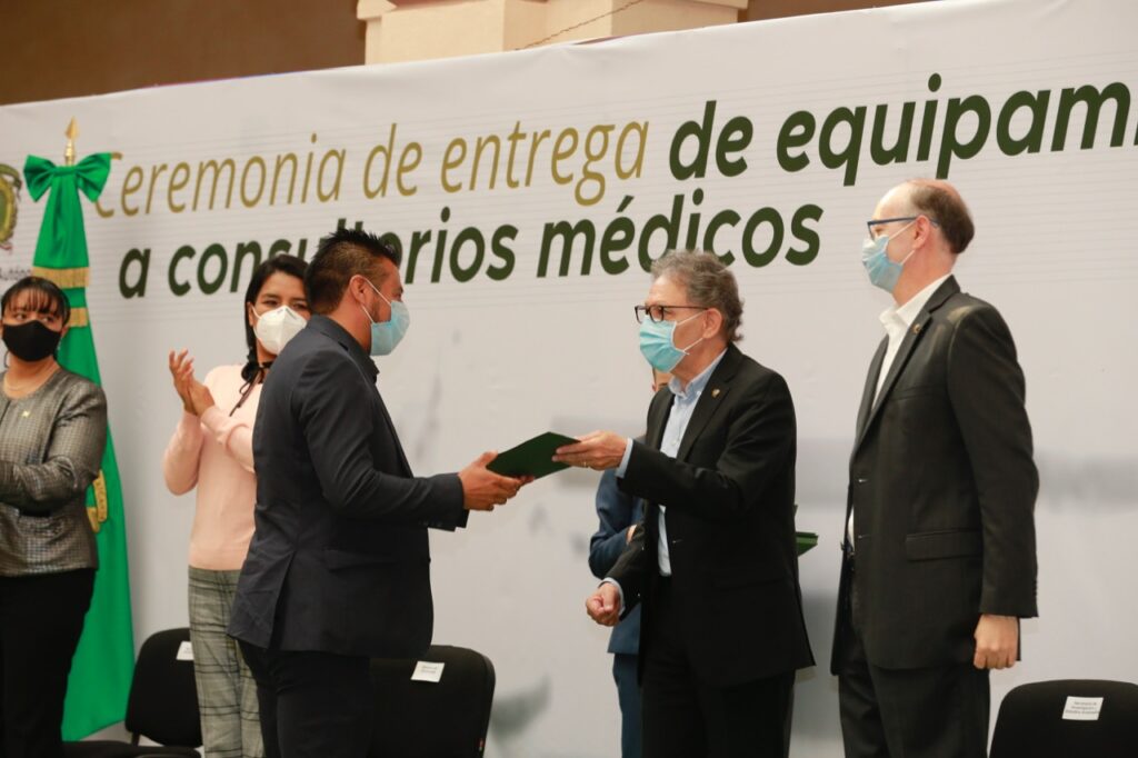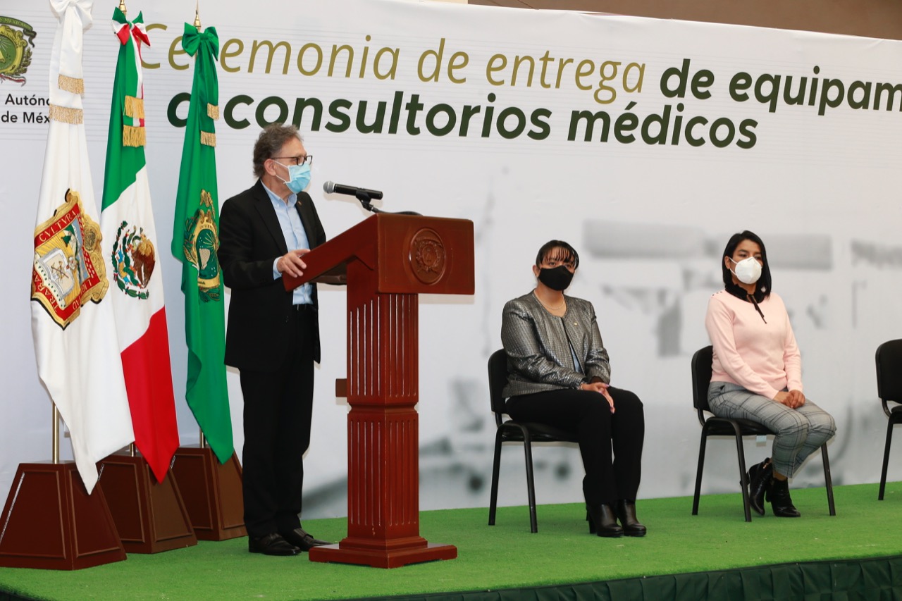 Toluca, México, 11 de agosto de 2020. El rector de la Universidad Autónoma del Estado de México, Alfredo Barrera Baca, encabezó la entrega de equipamiento a 22 consultorios médicos de la institución, que tiene como propósito facilitar y mejorar el trabajo del personal que se desempeña en estos espacios y alcanzar el máximo nivel de atención para estudiantes, académicos y trabajadores.