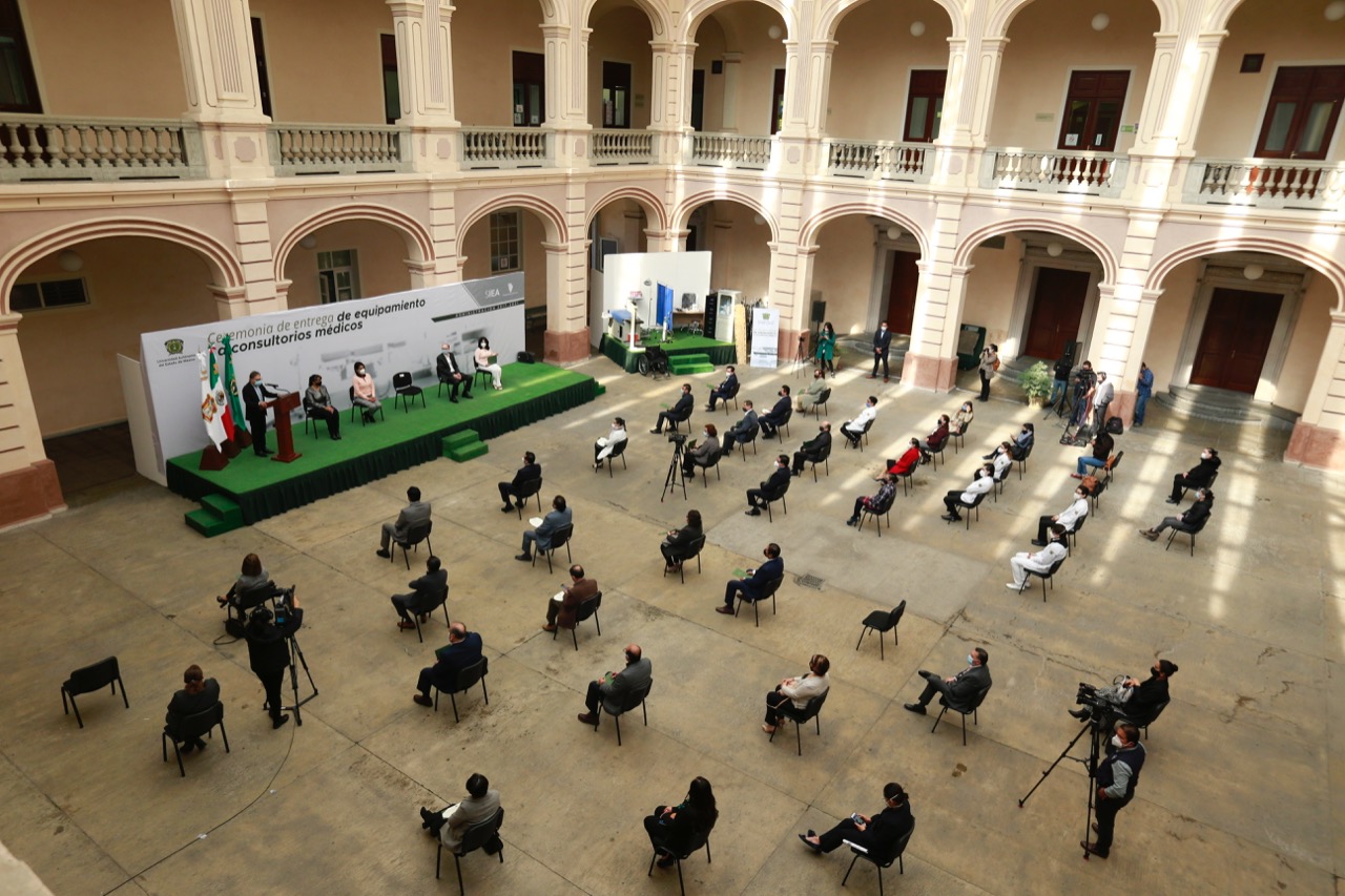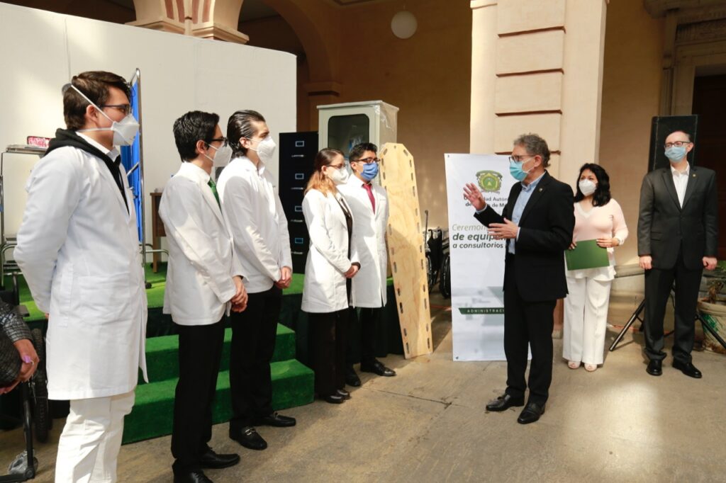 En el Patio del Centenario de Edificio de Rectoría, acompañado del secretario de Investigación y Estudios Avanzados, Carlos Eduardo Barrera Díaz, Alfredo Barrera afirmó que la entrega de mobiliario, equipo e instrumental para 22 consultorios de la institución bajo la Norma Oficial Mexicana NOM-178-SSA1-1998 es un mandato de la comunidad universitaria que se cumple junto con otras disposiciones de índole administrativa y sindical, con las cuales se asegura la convivencia de estudiantes, trabajadores y personal administrativo, bajo medidas de salud, higiene y seguridad.