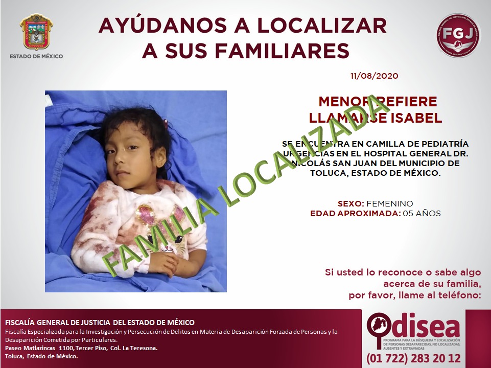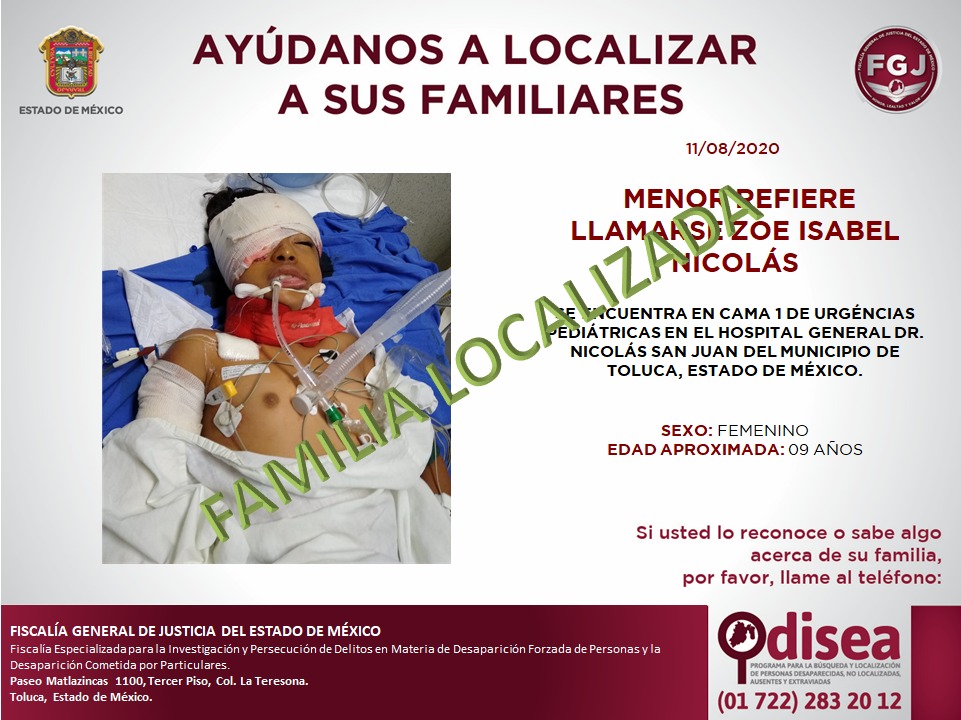 En seguimiento al protocolo respectivo, la Fiscalía General de Justicia del Estado de México (FGJEM), por medio del Programa para la Búsqueda y Localización de Personas Desaparecidas, no Localizadas, Ausentes y Extraviadas (ODISEA), emitió una ficha para la búsqueda y localización de los familiares de tres menores de edad, de cinco, nueve y 10 años de edad, aproximadamente, quienes resultaron con lesiones en el accidente ocurrido este día en la carretera México-Toluca, donde un autobús de pasajeros sufrió una volcadura.