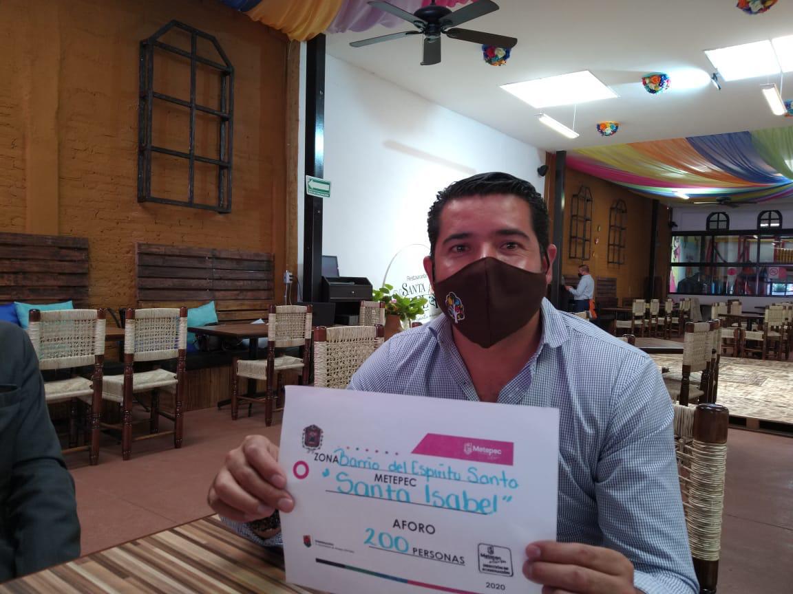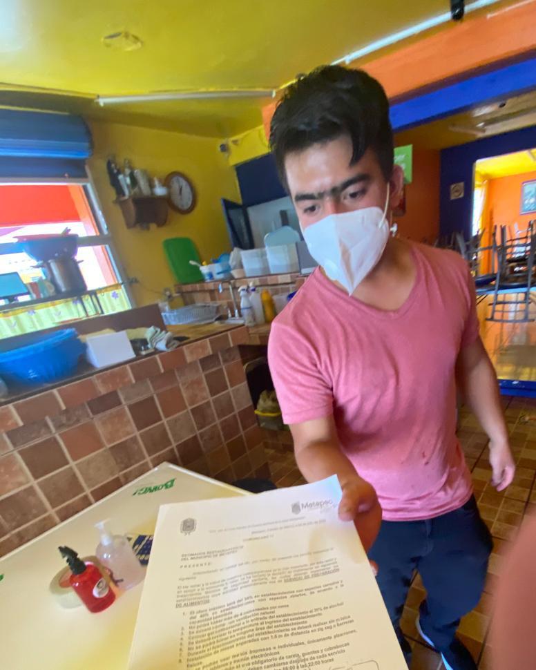 Metepec, México; 12 de agosto de 2020. Titánica labor realizan servidores públicos de Metepec adscritos a la Dirección de Gobernación municipal, vigilando el cumplimiento de medidas de prevención e higiene en el 70 por ciento de las unidades económicas que operan de forma responsable a partir del cambio de color a naranja en el semáforo de contagio.