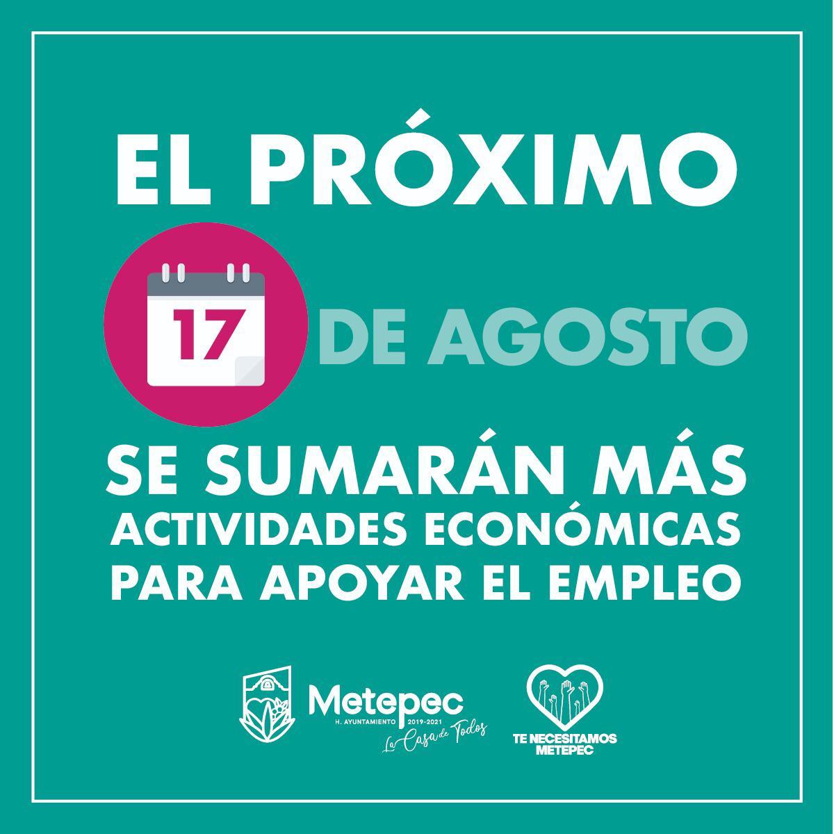 Metepec, México; 14 de agosto de 2020. A partir de la siguiente semana, algunas actividades culturales, recreativas y deportivas en Metepec, estarán regresando con estrictas medidas de sanidad para garantizar que en el proceso de apertura escalonada se cumplan con las recomendaciones de salud para los trabajadores, proveedores, clientes y/o usuarios.