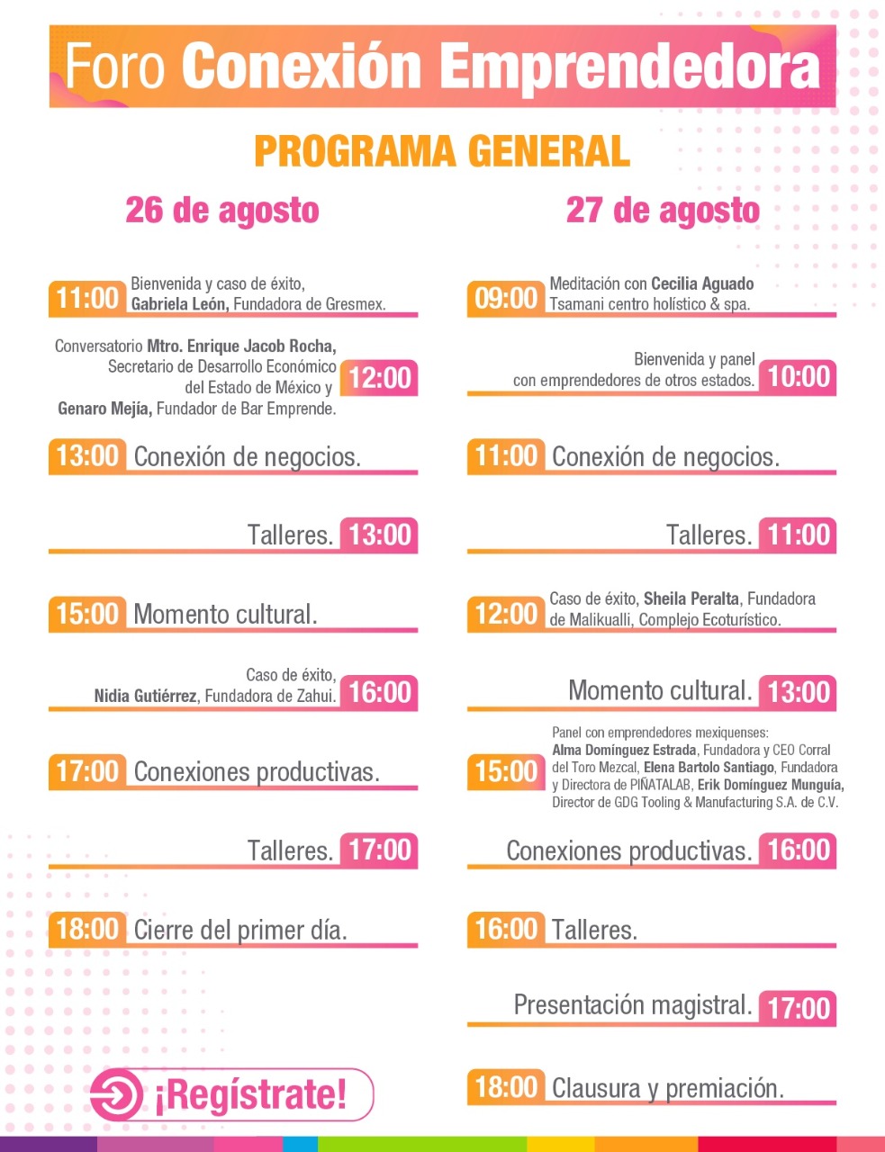 Dentro del Foro Conexión Emprendedora, los interesados podrán encontrar talleres, casos de éxito, así como momentos culturales. Además, en el espacio denominado “Conexiones de negocio”, se realizarán encuentros entre compradores y vendedores, con base en el diagnóstico de madurez de los emprendedores, esto con un registro previo.
